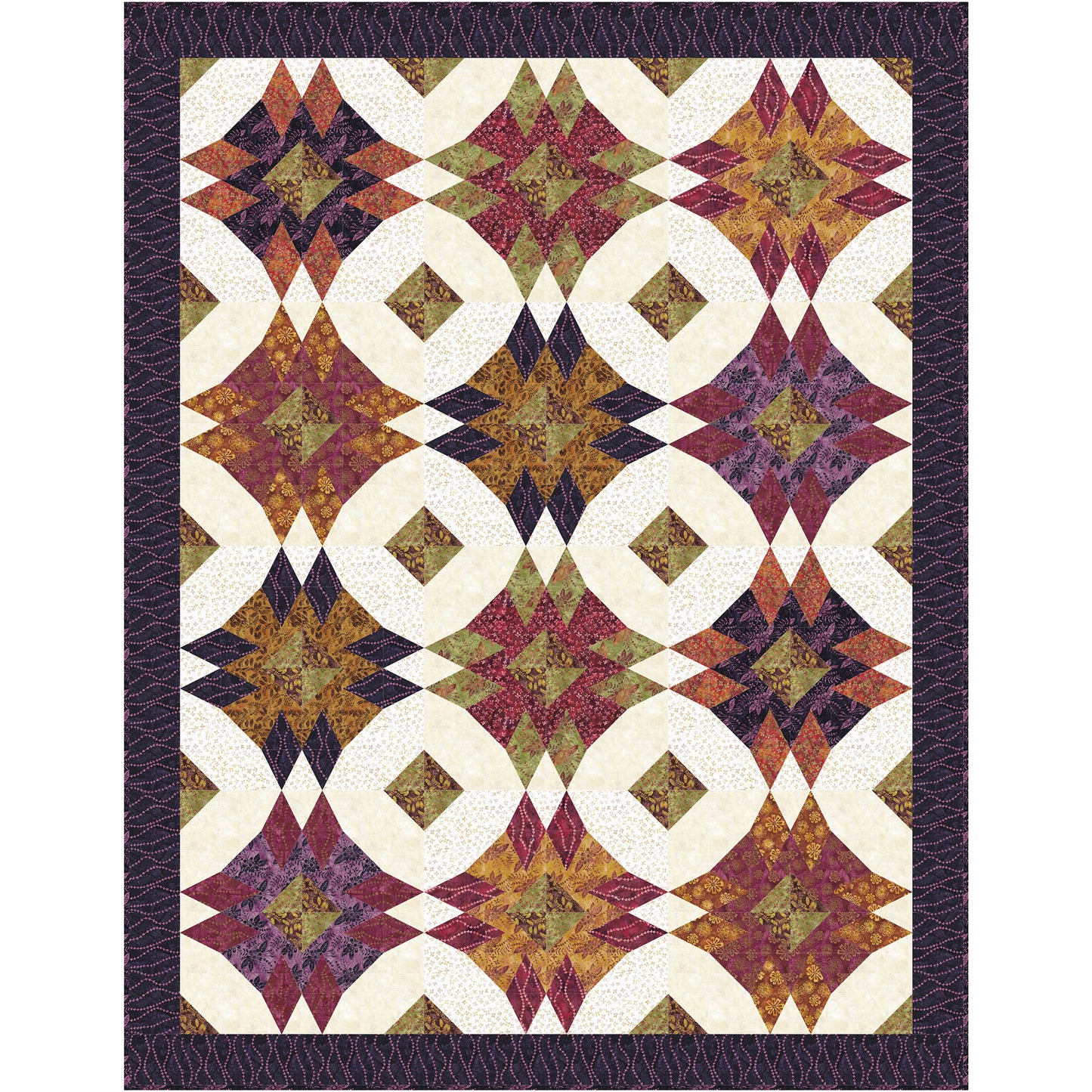 Let your creativity soar with the Enchanted Stars quilt pattern, a beautiful project that combines the mystique of stunning star shapes with the rich, earthy tones of the Earthy Enchantment fabric collection by Tiffany Hayes for Island Batiks. This pattern is designed to captivate and impress, with every star block adding a touch of magic and elegance to your quilt. The quilt is all straight line piecing with the illusion of curves.