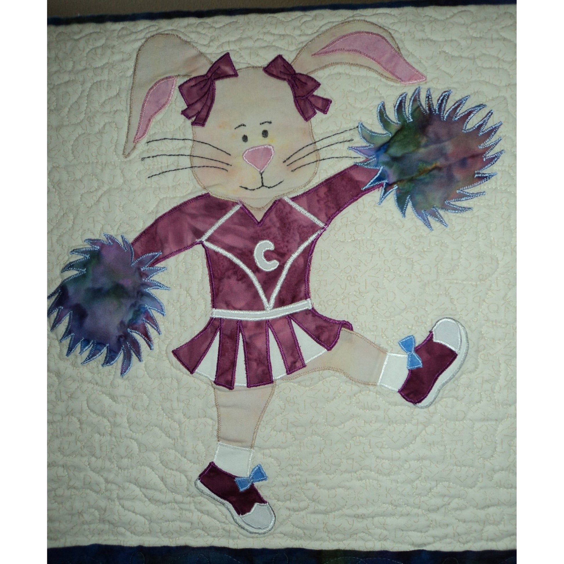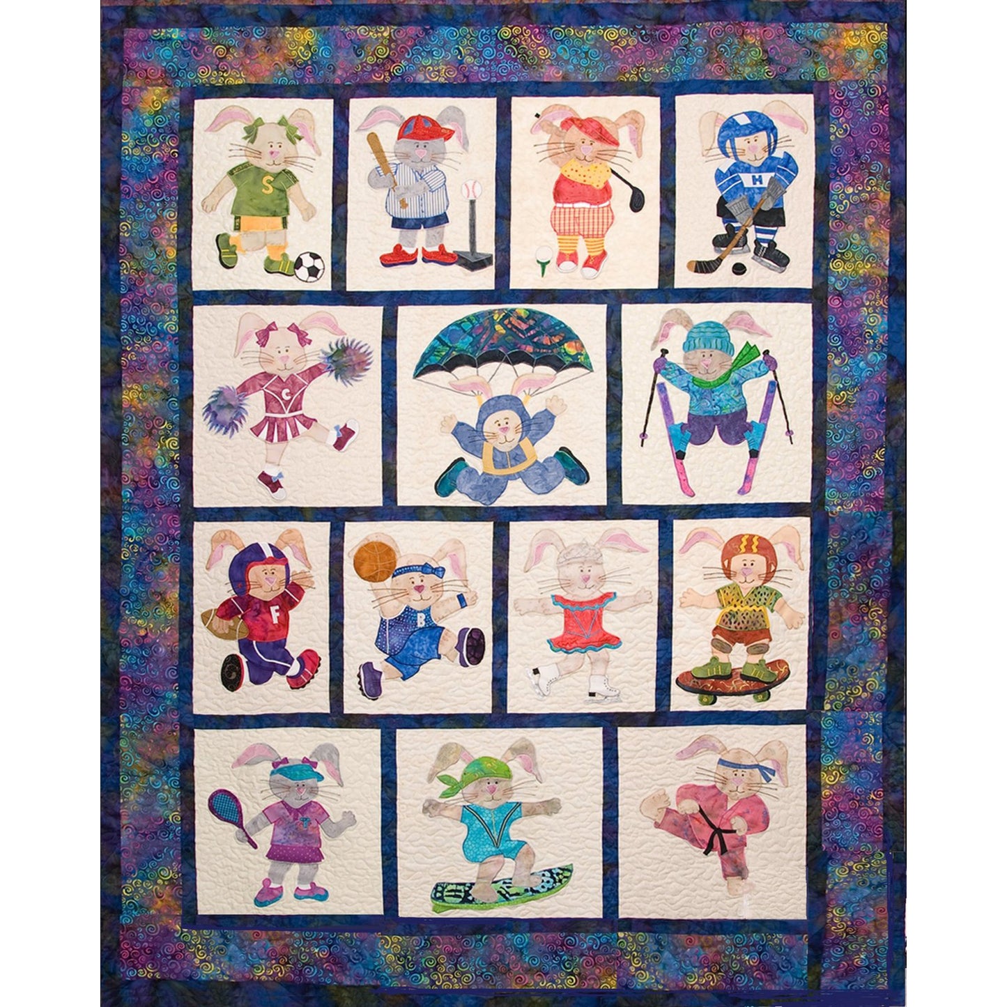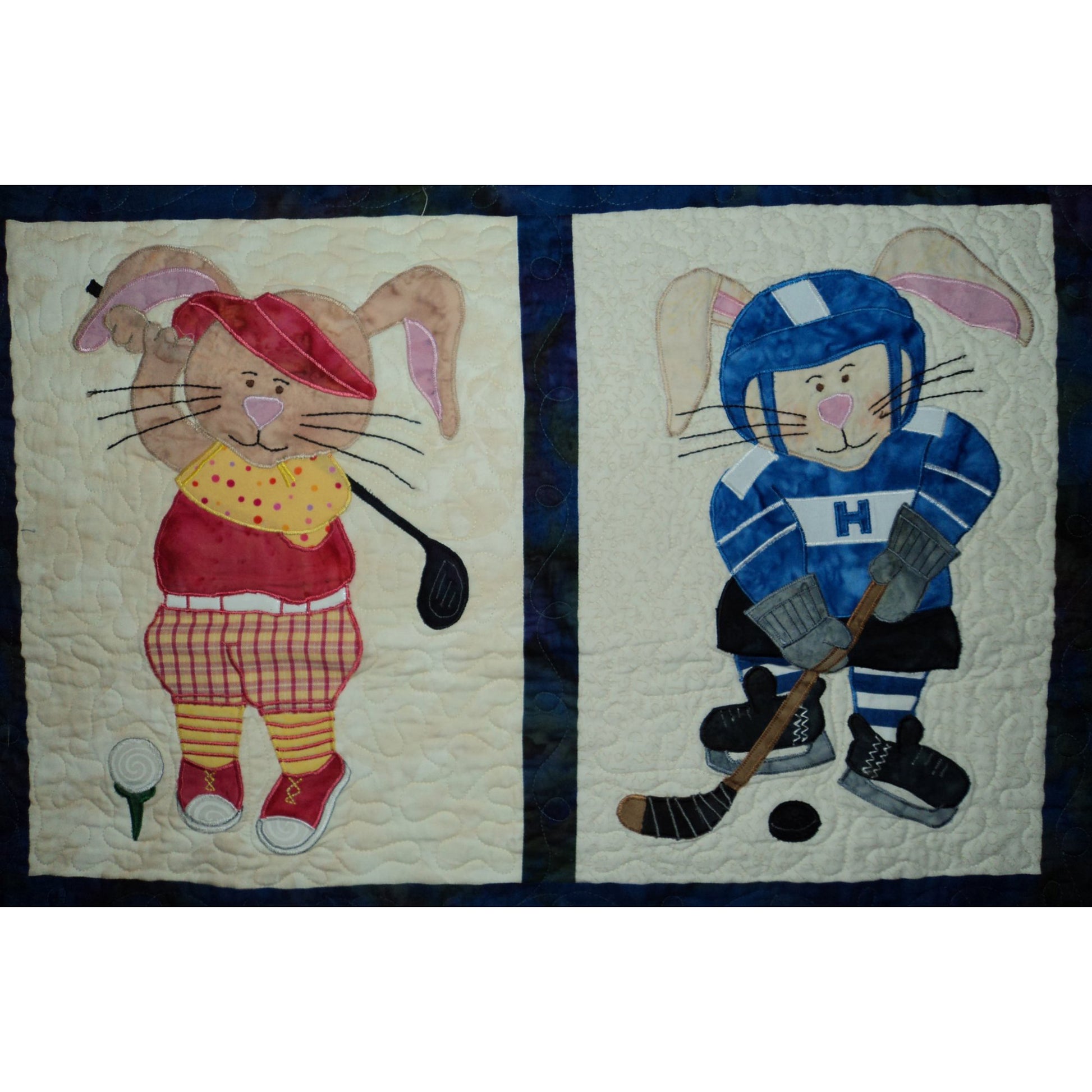These bunnies are working off some of their excess energy by participating in their favorite sports activities. No sitting in front of the TV or computer for them! There are too many new things to do and try. If you prefer a smaller quilt, perhaps geared to just girls or boys, you could achieve this effect by choosing seven blocks and insert your favorite bunnies. By changing clothing colours you can create your desired gender. Alternatively you may want to take one of the bunny designs and create a single wall hanging, (tote bag or cushion) as depicted on the pattern cover. Wall hanging 52 1/2" x 68 1/2" Twin quilt 65" x 81"