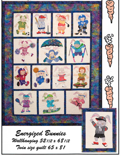 These bunnies are working off some of their excess energy by participating in their favorite sports activities. No sitting in front of the TV or computer for them! There are too many new things to do and try. If you prefer a smaller quilt, perhaps geared to just girls or boys, you could achieve this effect by choosing seven blocks and insert your favorite bunnies. By changing clothing colours you can create your desired gender. Alternatively you may want to take one of the bunny designs and create a single wall hanging, (tote bag or cushion) as depicted on the pattern cover. Wall hanging 52 1/2" x 68 1/2" Twin quilt 65" x 81"