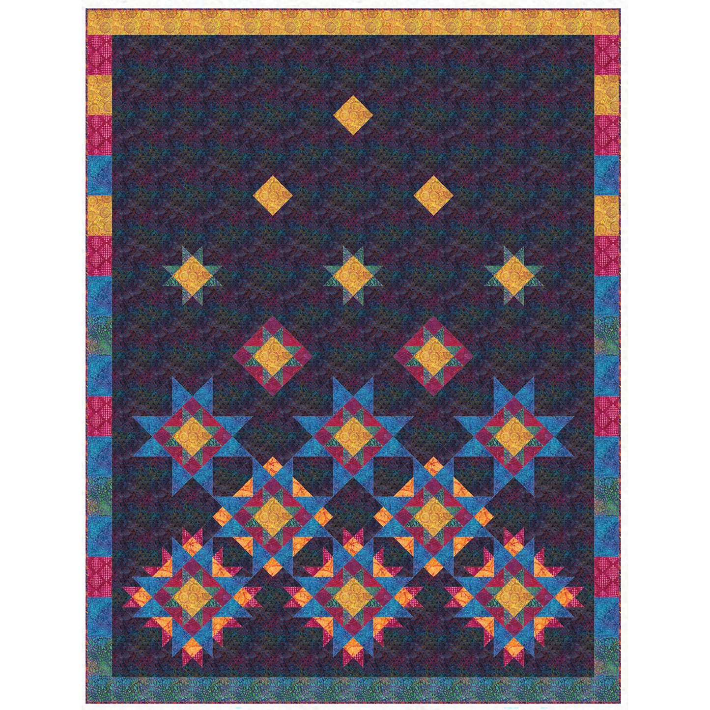 This exciting quilt pattern is both unique and fun. The construction is simple, the finished project deceptively complex. This quilt looks great draped over a bed, with the illusion of stars growing as they fall. Jess' clear instructions and full color graphics make it even more fun.