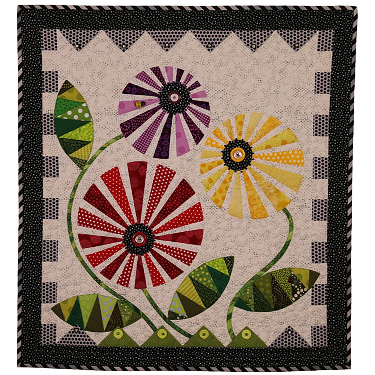The bright, colorful flowers in this happy wall quilt are pieced using a 22.5° wedge ruler. The leaves are paper-foundation pieced. Flowers, leaves and stems are then machine appliqued onto the background. The design offers many possibilities for embellishment with stitching, buttons or beads.