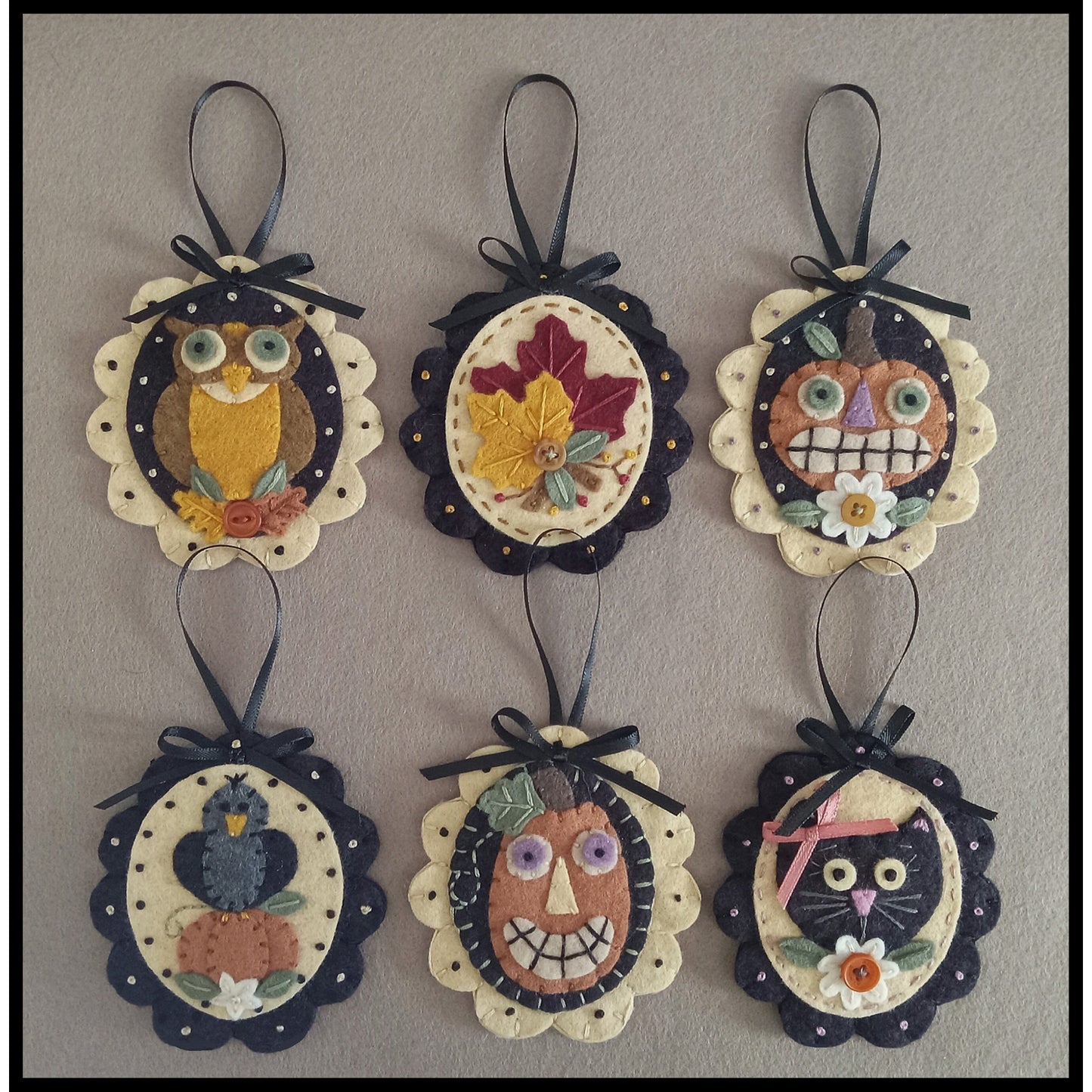 Six Halloween felt ornaments pattern featuring cute owls and pumpkins, perfect for adding a festive touch to your decorations.