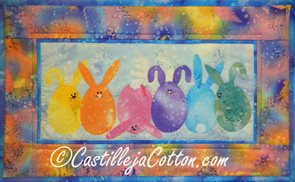 Adorable bunny wall hanging quilt pattern. Would make a great Easter decoration. Fabric line shown is Fossil Fern by Benartex.