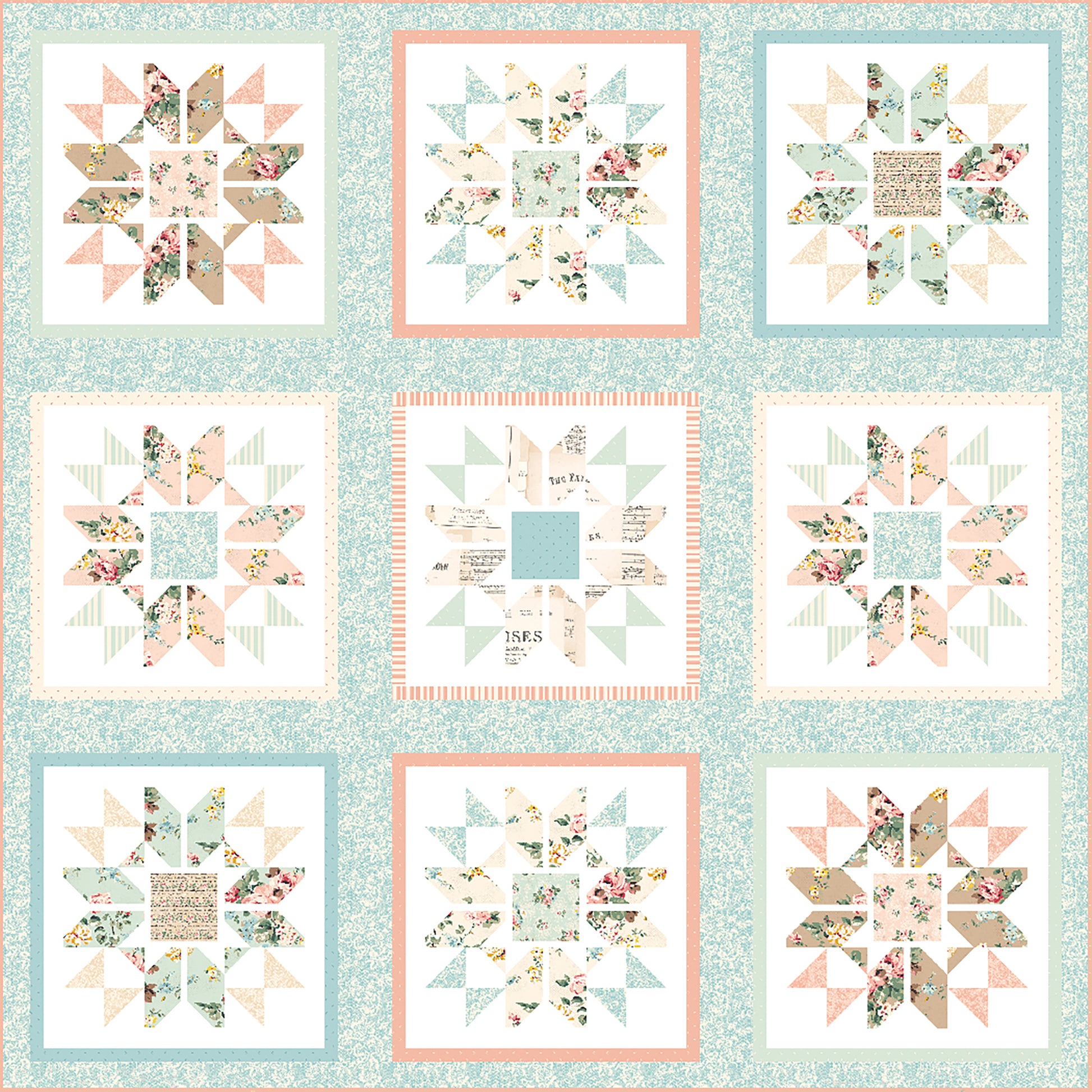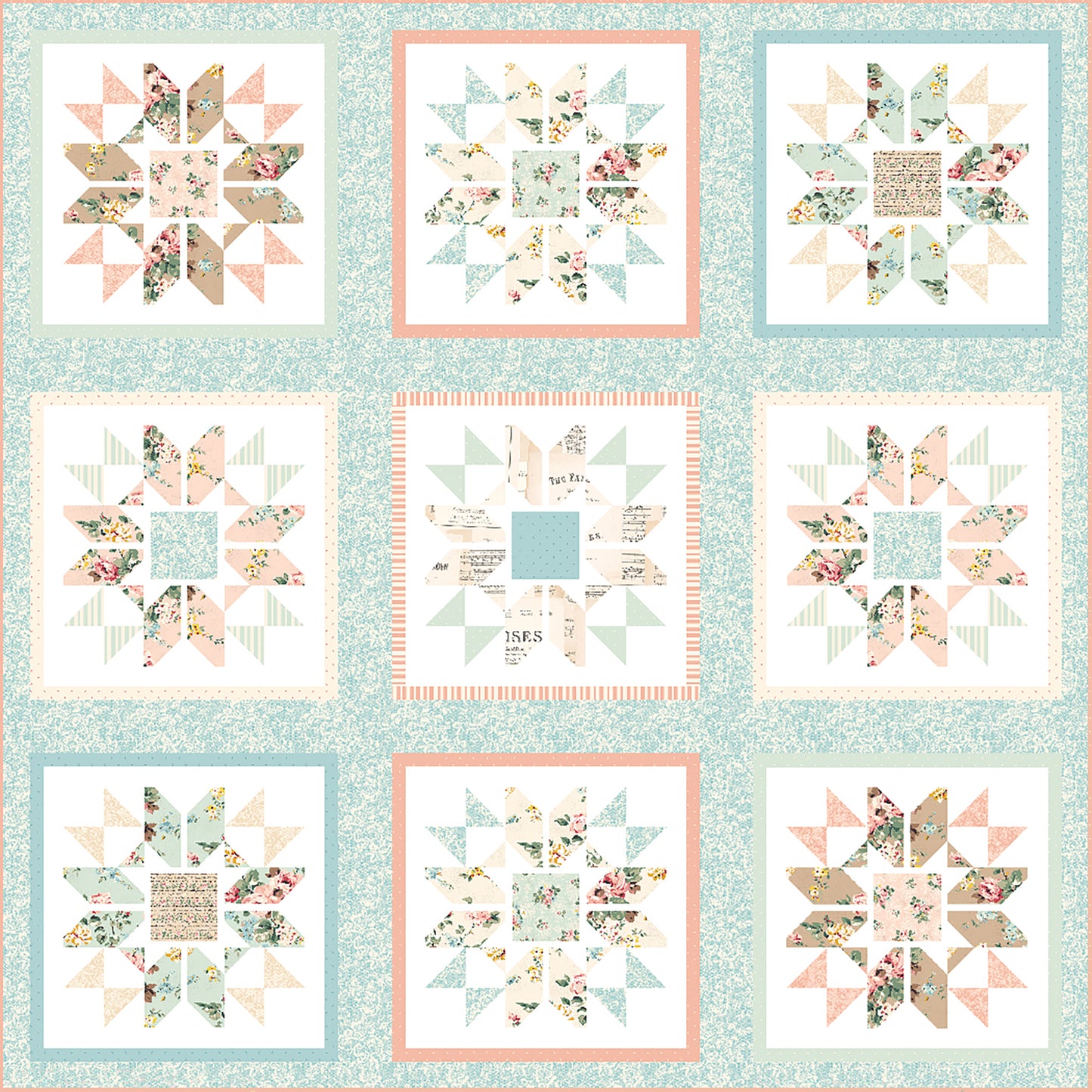 Flowering Bouquets quilt pattern by Heidi Pridemore of The Whimsical Workshop is a beautiful star/flower quilt. Fabric shown in the sample quilt is "Rose and Violet" fabric line from Riley Blake Designs