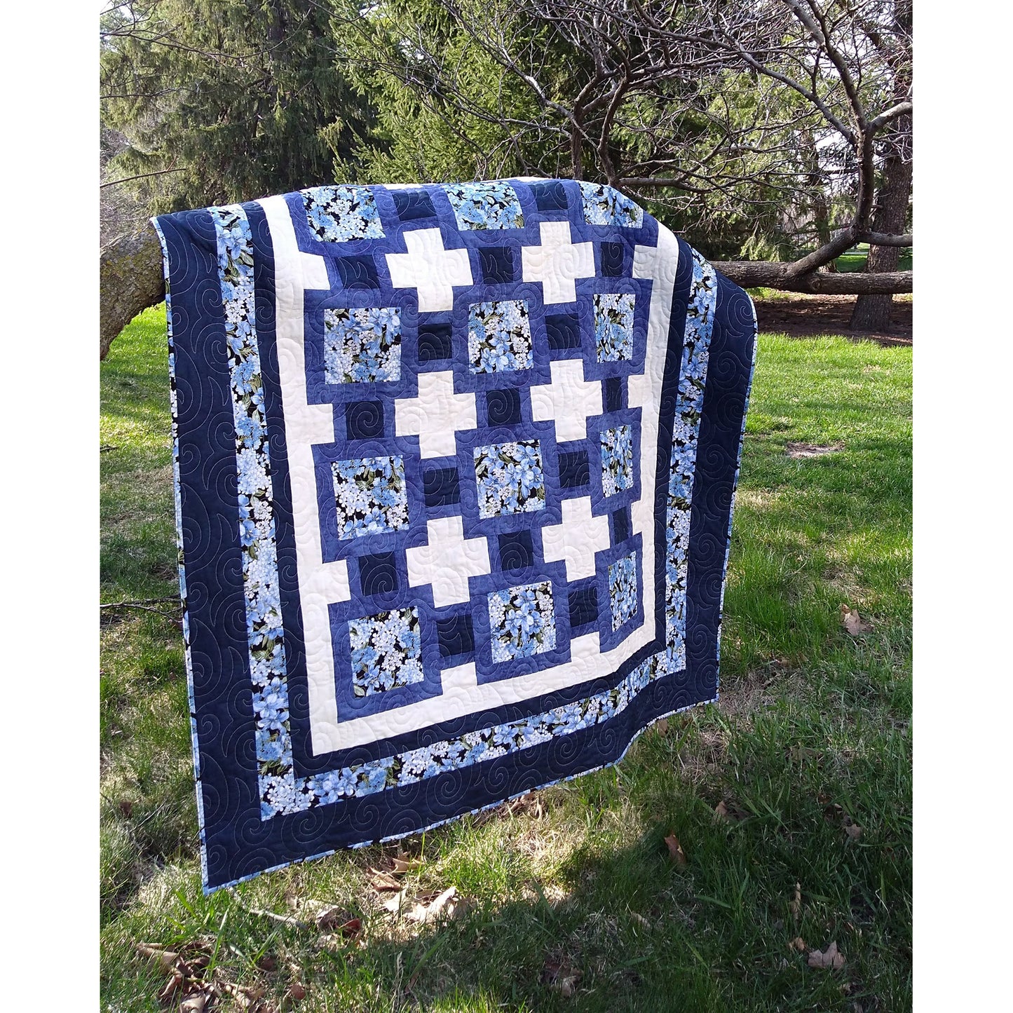 Focus Squared was designed to showcase a favorite medium-to-large-scale focal print. The design works with any theme, from florals to novelty or seasonal prints. This beginner-friendly pattern uses some strip piecing to speed assembly. Includes 5 sizes, each with separate cutting instructions for clarity: baby (37 x 49), throw (53 x 65), twin (66 x 90), queen (86 x 95) and king (108 x 96). Sizes are stated in inches.