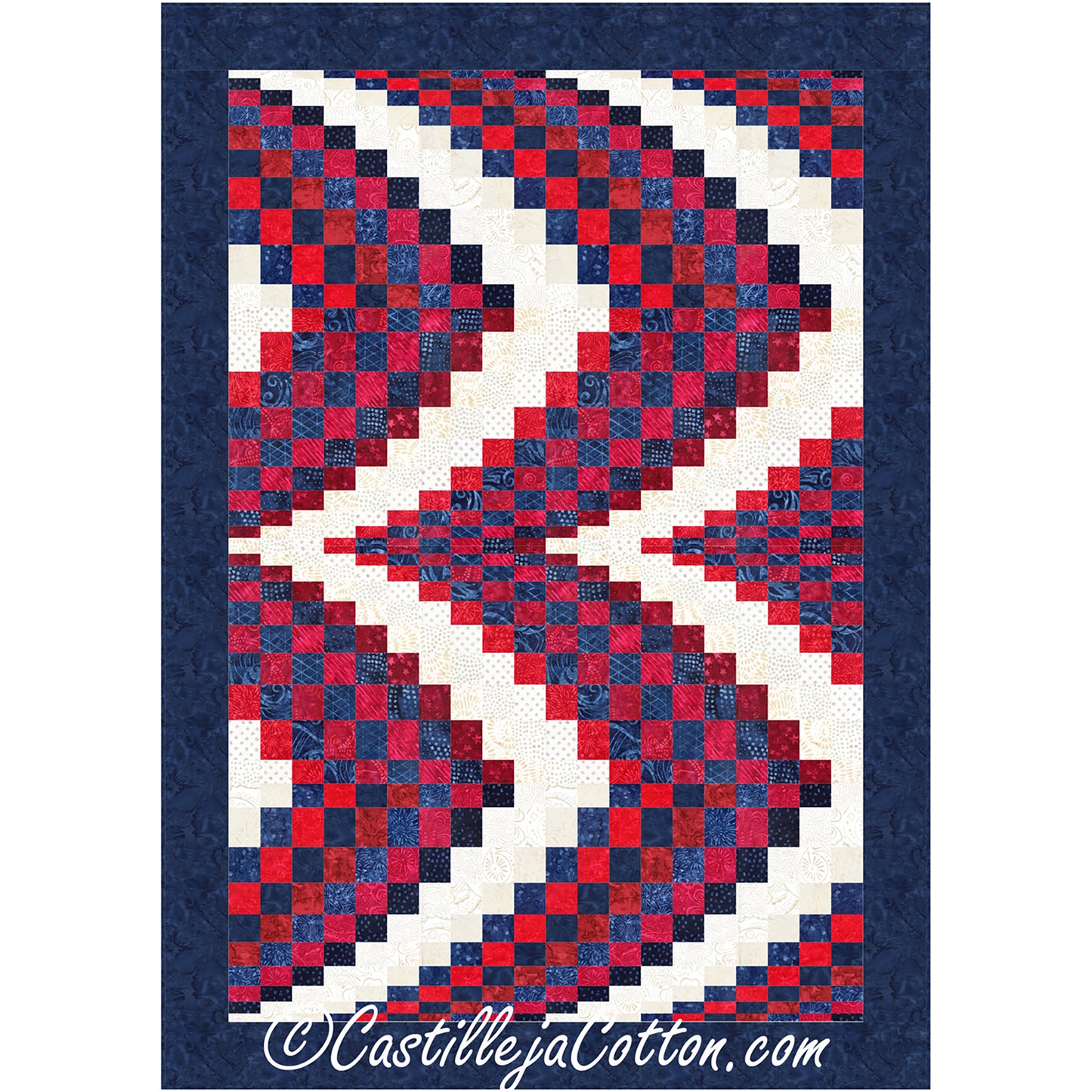 Two repeated blocks using bargello construction method. Precut strip set. Fabric shown in the sample quilt is Timeless Treasures Fabrics Tonga USA (Available 2025-02-01). Colors: red, navy, white