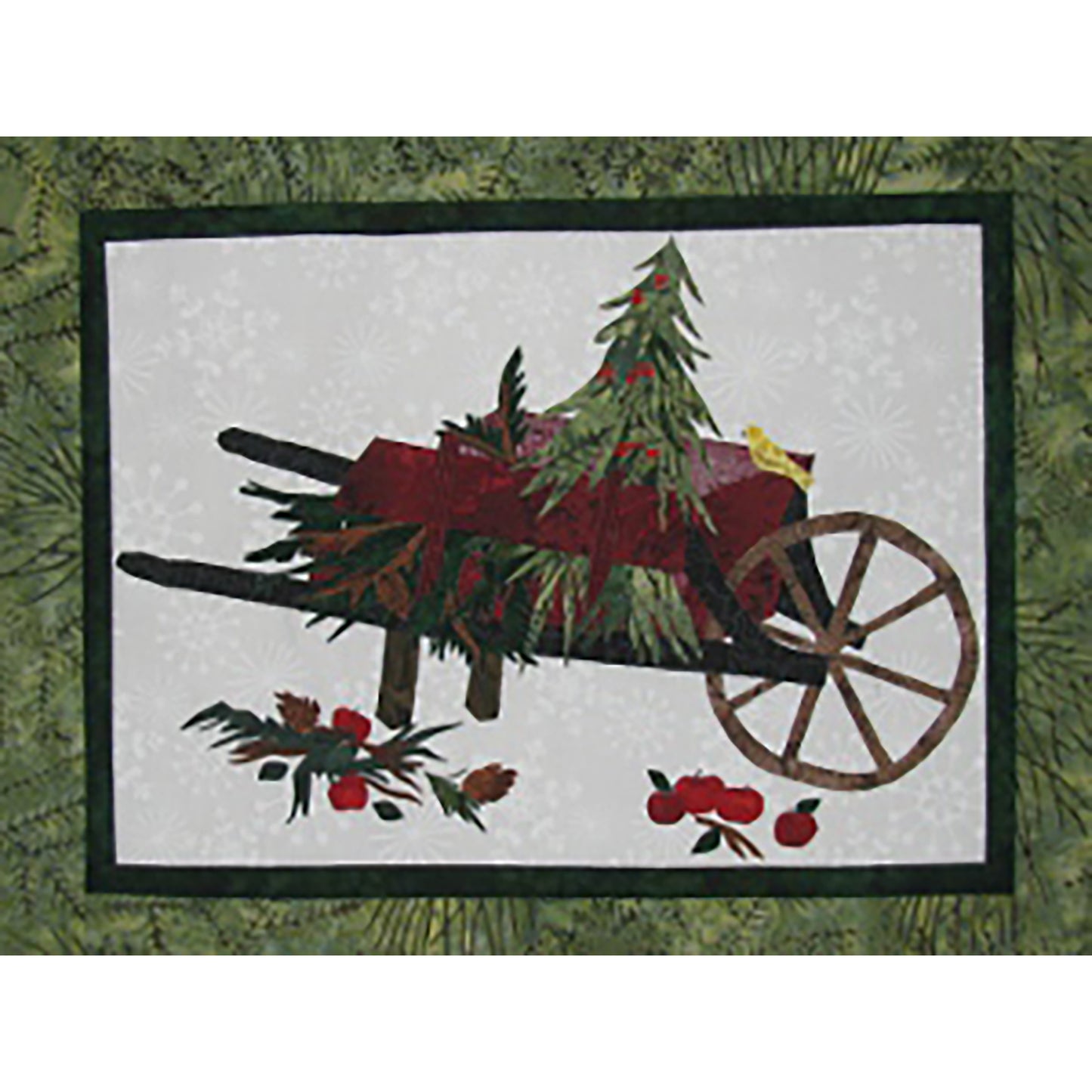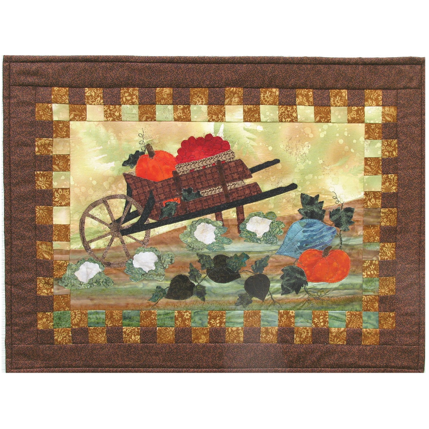 A well worn wheelbarrow speaks of years of gathering in produce, firewood, fall leaves, bushels of apples, even an occasional giggling child or two! Use this pattern as a guide to fill one of your own with a harvest of memories. The appliqued pieces are fused raw-edged, then top stitched and quilted.