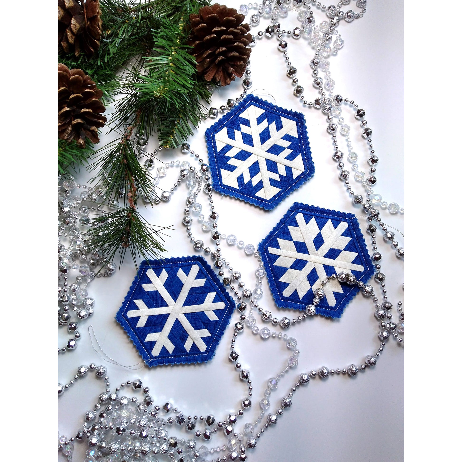These delicate foundation paper pieced ornaments each measure 4 ¼ inches from point to point across the middle. Use as ornaments for Christmas or winter, as elegant gifts tags, or incorporate the snowflakes into other projects such as Christmas stockings. The pattern includes a coloring page to help choose alternate color placements to create new flake designs from the same foundation.
