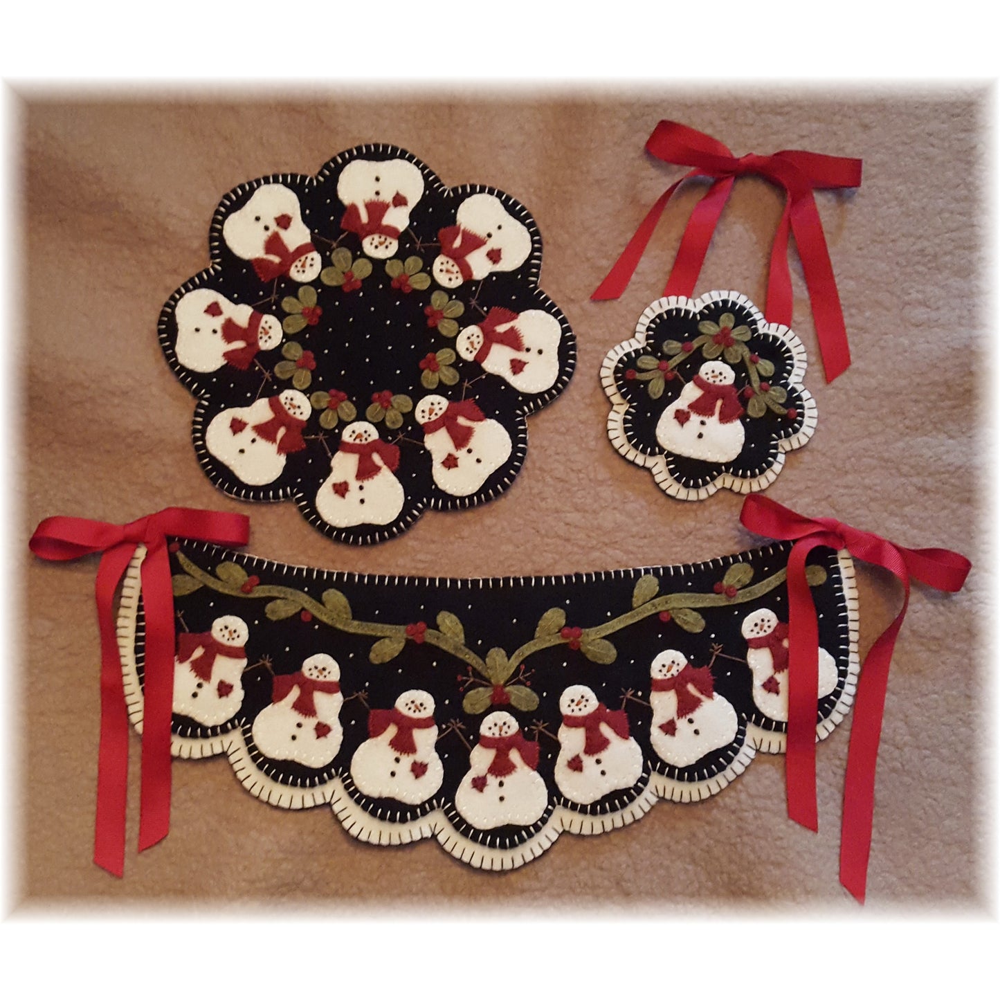 So many sweet little snowmen to decorate your home this holiday season! These jolly fellows are so much fun to stitch up! The swag measures 6 1/2" by 17", the candle mat measures 10" and the mini mat measures 5". Create these fun holiday accents using wool or wool felt. So much fun & very easy to make!