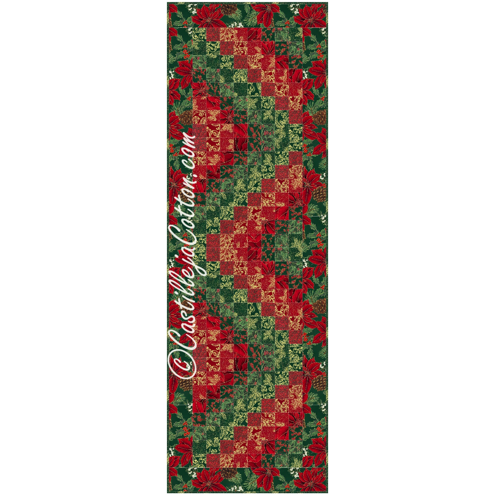 A great table runner pattern! Easy to make using just one block. Fabric line shown is Warm Wishes Gold by Hoffman Fabrics.