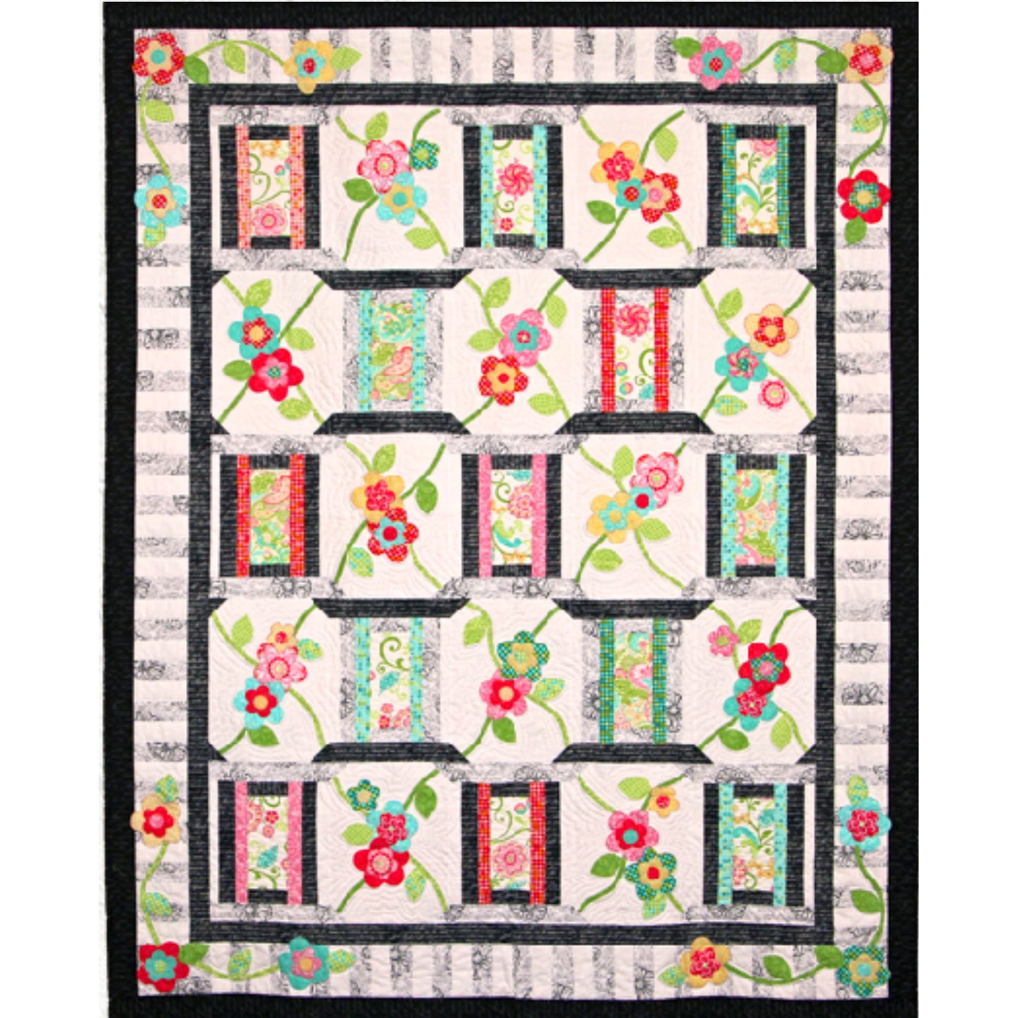Vibrant colorful flowers vining over a garden trellis make a very pretty quilt with a hint of a modern look. Garden Trellis is made with simple pieced blocks and machine fusible appliqué blocks.