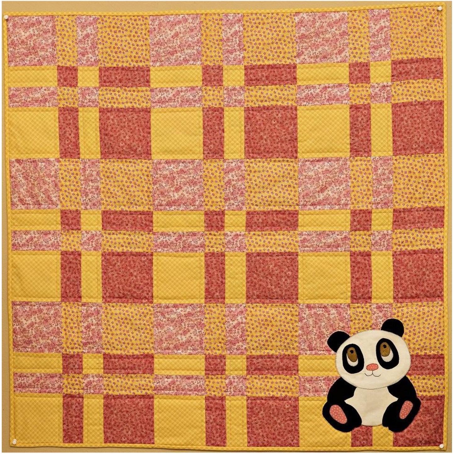 This whimsical 42" by 42" PDF baby quilt pattern features an adorable giant panda applique and easy patchwork blocks. Even if you are a novice quilter, you can follow our instructions and make this beautiful quilt yourself! The photos here show the quilt in pinks and yellows, perfect for your beautiful baby girl! The quilt would be equally adorable made in more masculine fabrics for that special little boy.