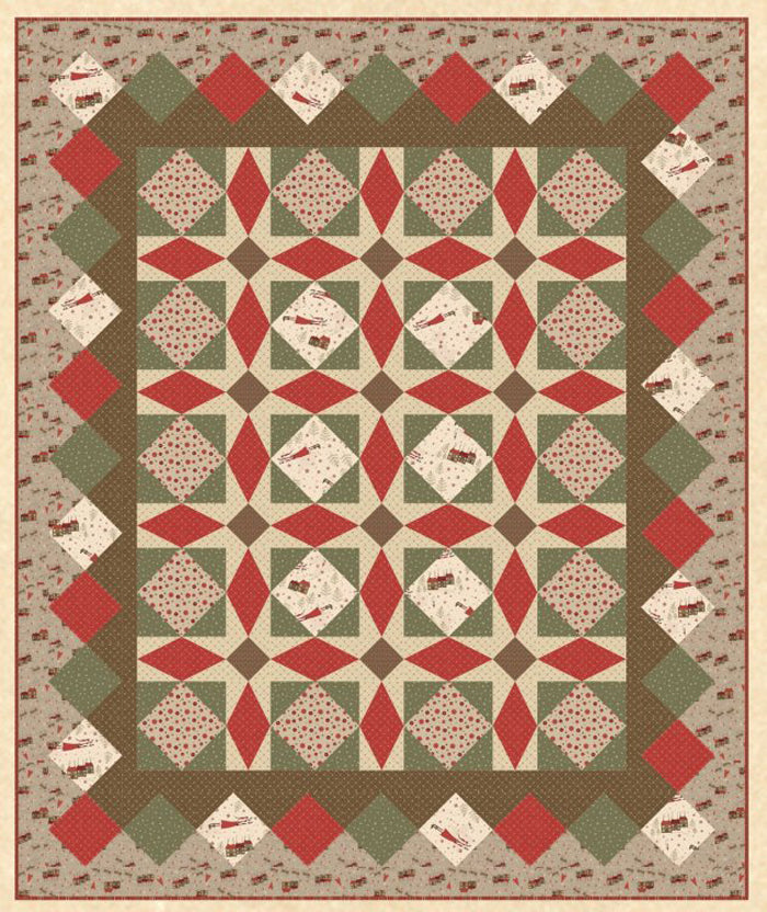 This great lap size quilt pattern. Will be perfect for the holidays in colors of gingerbread, rosy red & green from Lynette Anderson's Winter Village line for RJR. The square-in-a-square cornerstone blocks create the center of the stars and the sashing blocks create the star points. The blended border is also created from square-in-a-square blocks and is easy to do with careful color placement.
