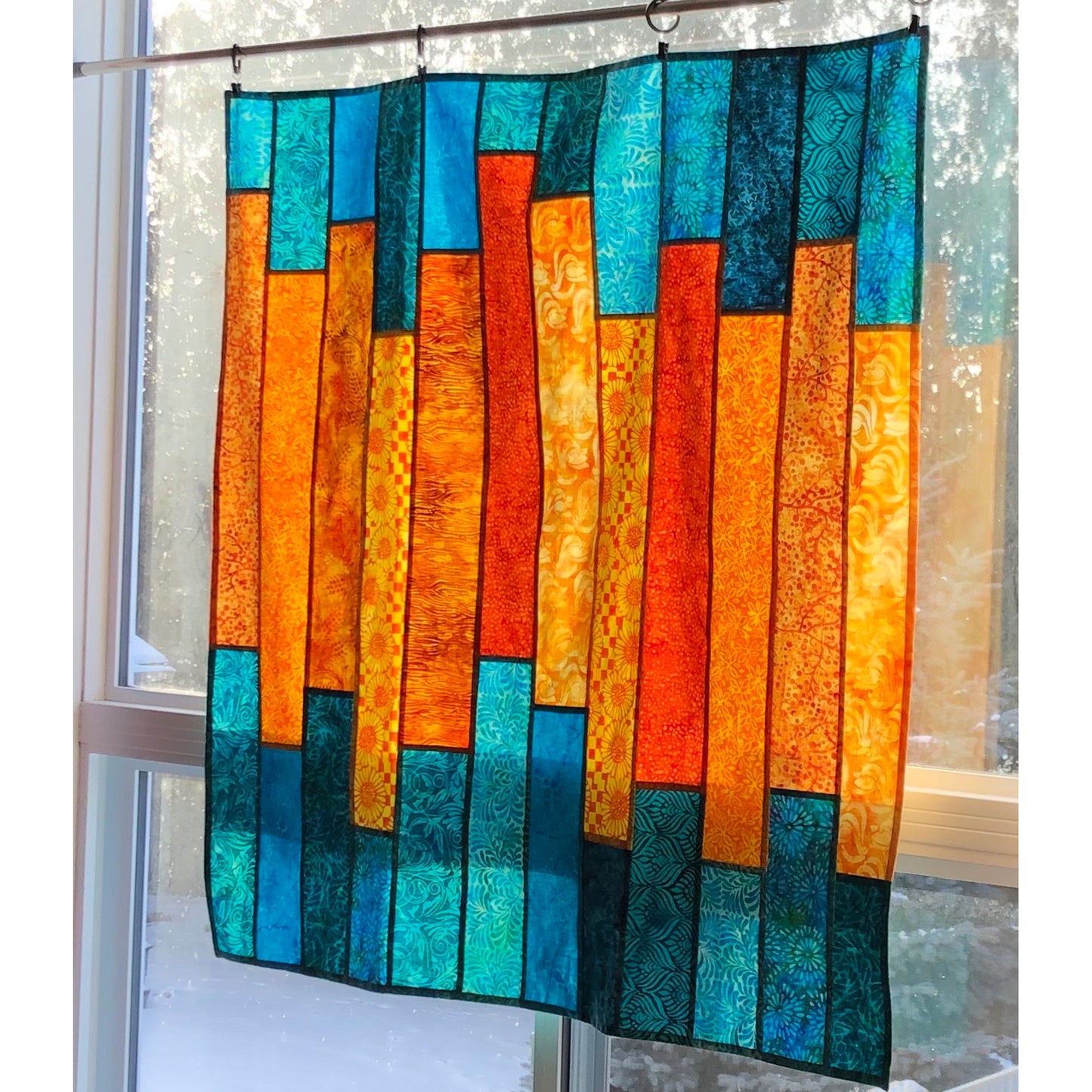 Use batik fat quarters to make a one of a kind window hanging. Reversible pojagi seams are finished on both sides and give a stained glass effect.