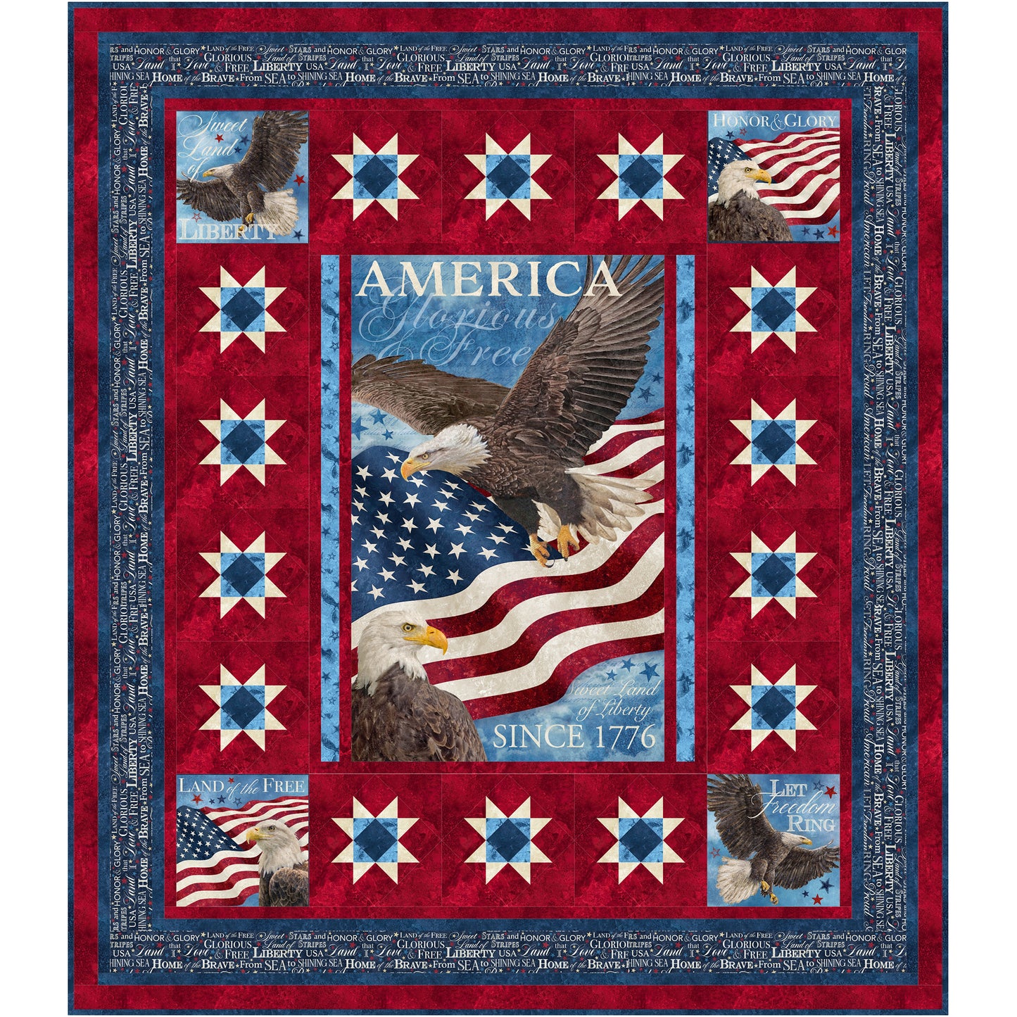 Celebrate the spirit of freedom and pride with the Glorious & Free quilt pattern, designed for Northcott’s Stonehenge Stars & Stripes 13 Collection. This striking design features a bold center panel showcasing a majestic flag, with eagles symbolizing strength and liberty. The central imagery is elegantly framed by beautifully pieced stars.