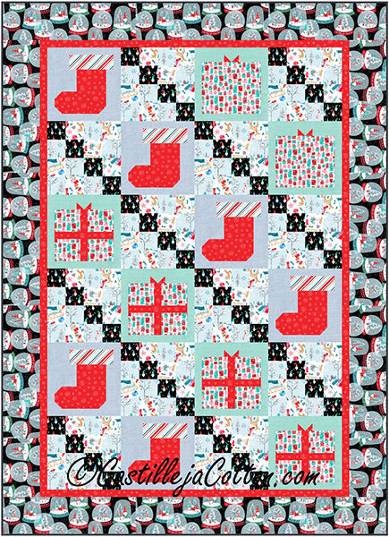 Pieced gifts, stocking and 16 patch blocks. Christmas lap/throw quilt. Perfect addition to your holiday decorations.Fabric shown in the sample quilt is Timeless Treasures Fabrics Gnome for Christmas.