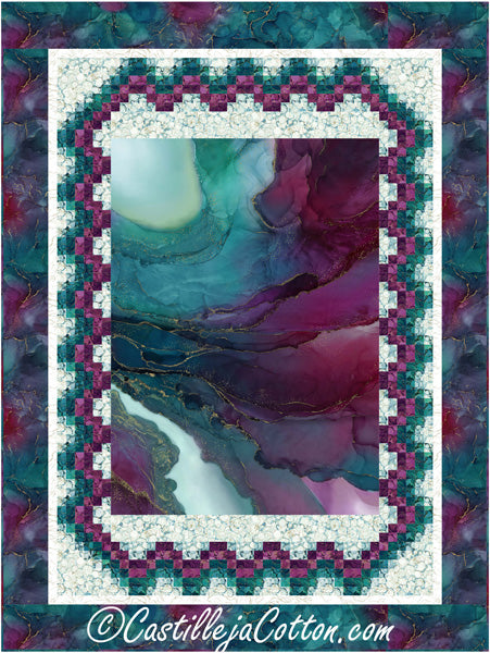 Panel with a pieced border. Fabric shown in the sample quilt is Northcott Fabrics Midas Touch (Available 2024-02-01). Colors: teal, magenta, cream
