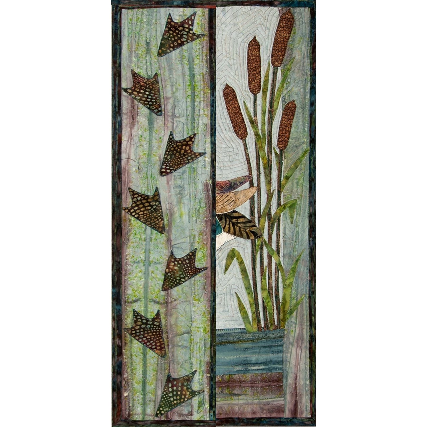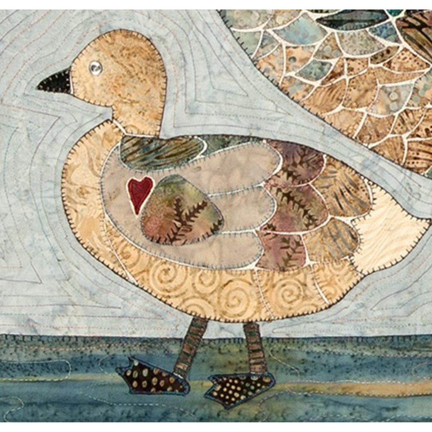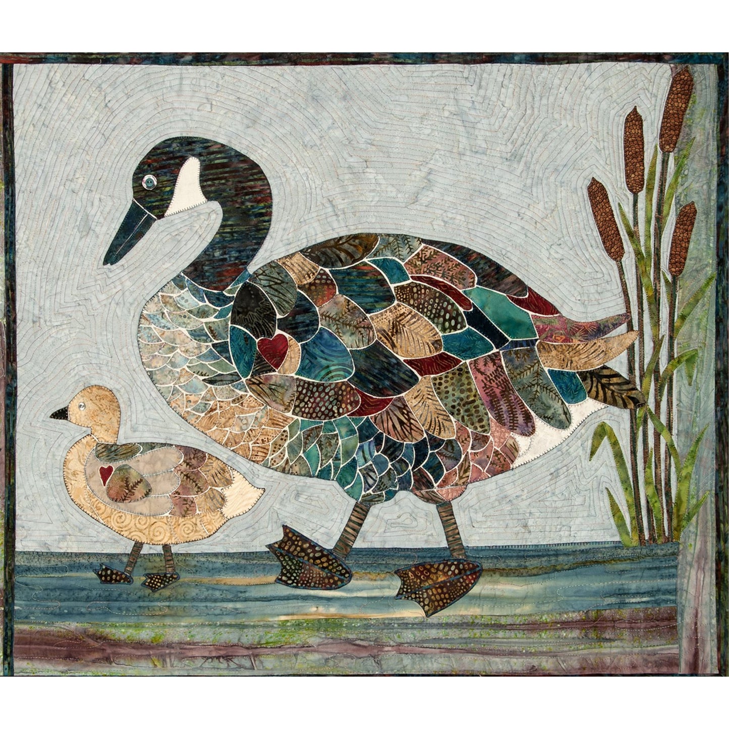 Mama is teaching baby how to navigate her surroundings as they waddle through the bulrushes along the river bank, leaving footprints along the way. Let your imagination and artistic license soar by creating this goose with "her coat of many colours". We used a selection of feathery batiks which are readily available allowing for the graduation of colours. The machine appliqué pattern includes a full size drawing with feathers numbered and colour coded. Finished Size 40" x 50"