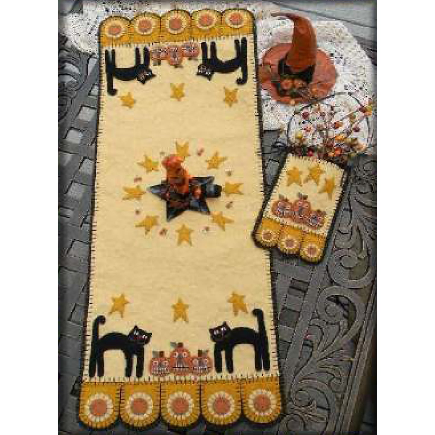 This festive Halloween penny rug & penny pocket pattern can be easily stitched up using wool or wool felt in wonderfully warm shades of Autumn! The finished runner measures 11 inches by 29 1/2 inches. The penny pocket measures approximately 4 1/2 inches by 7 1/2 inches not including the ribbon hanger. This pattern is a real Halloween "treat"!
