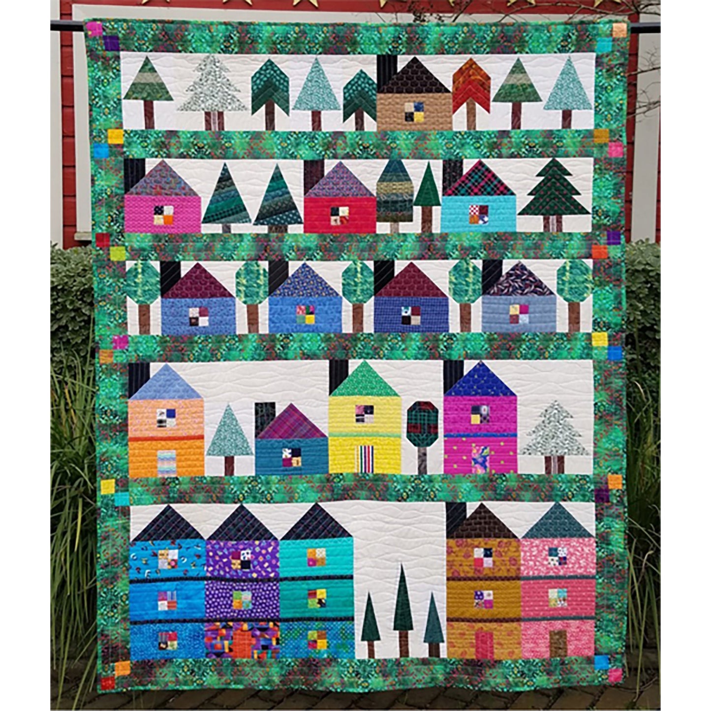 Have fun with this row quilt that depicts a country home, suburbia, urban homes, custom homes, and condos and townhomes. Easy paper pieced trees complete the picture.