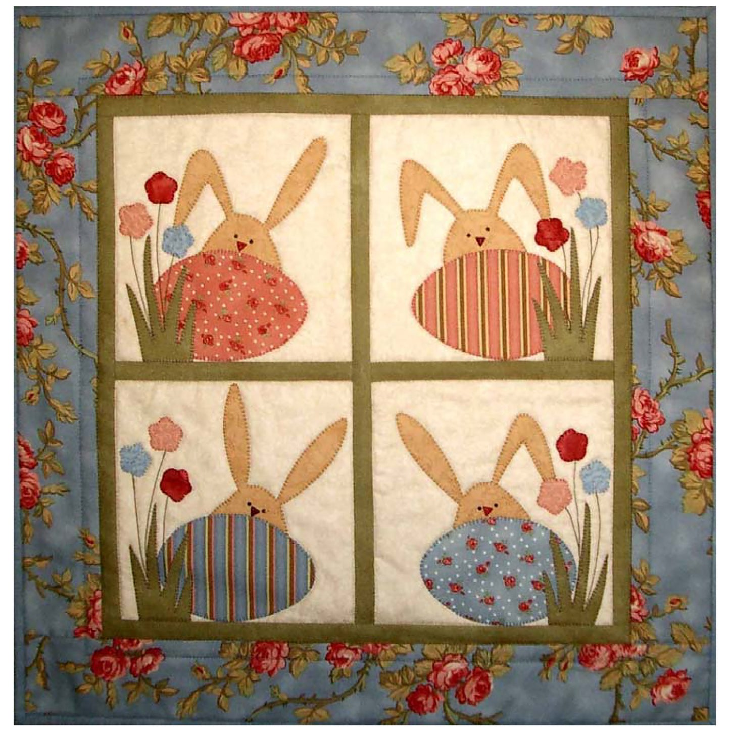 Four playful bunnies adorn this cute Easter wall hanging quilt pattern.