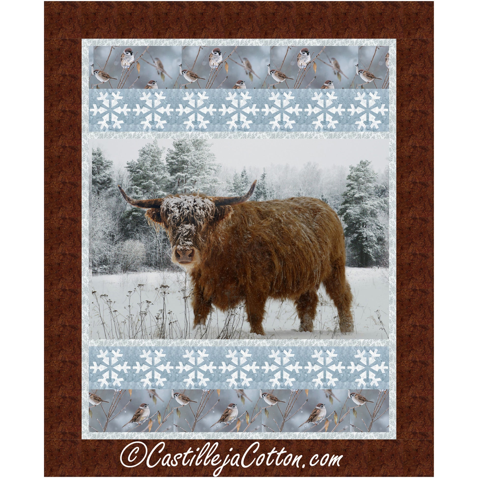 Panel with a Highland Cow. Snowflake appliqued block border and sparrow border. Fabric shown in the sample quilt is Hoffman CA Fabrics Call of the Wild Highland Cow and Sparrows (Available 2025-04-01). Colors: brown, grey