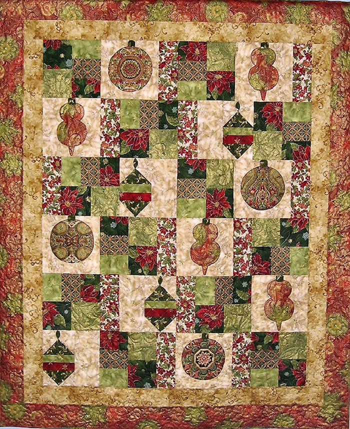 This throw quilt pattern is a great project to use scrappy, Christmas fabric. Find a large print for the round and tear drop ornaments. Easy strip pieced blocks and large fusible shapes.