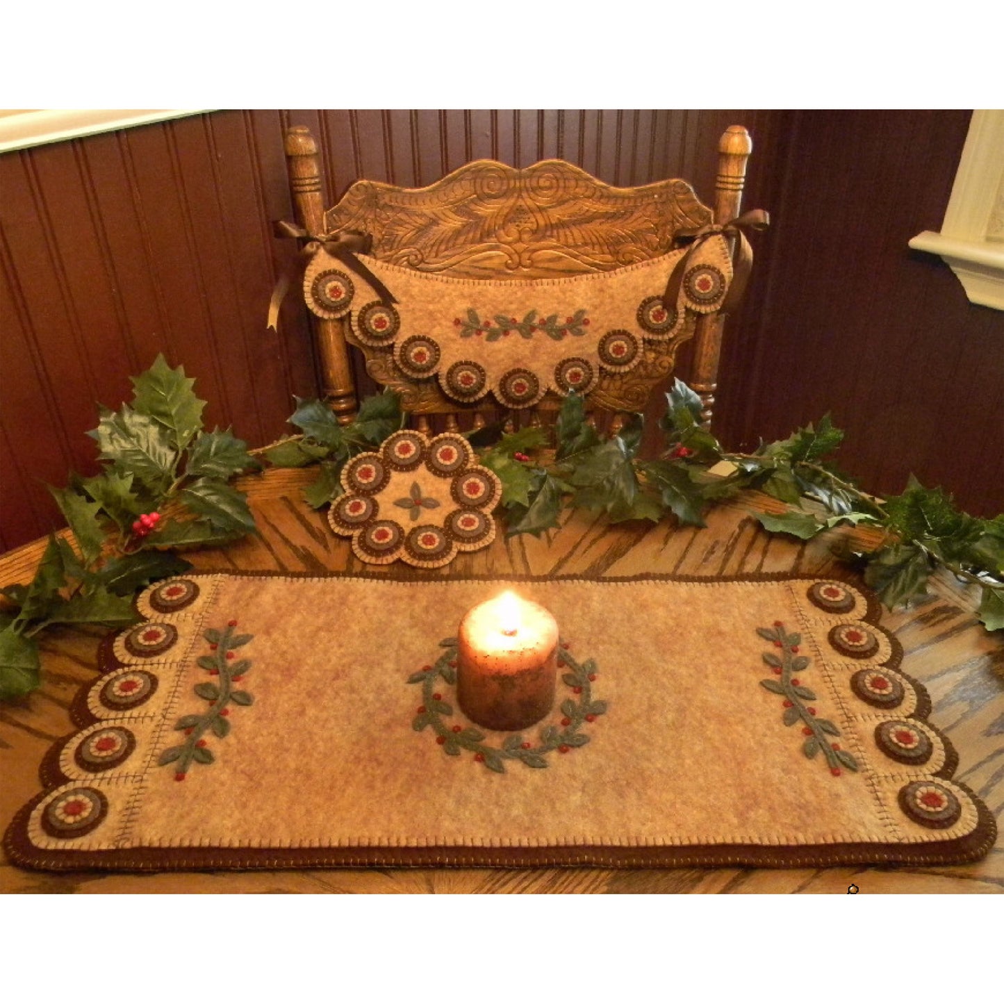 Beautifully prim set for your kitchen or dining room. This pattern is easy to make using wool or wool felt. The runner measures approximately 12" by 26", the chair swags 5 1/2" by 17", and the mini mats 6 1/2". This pretty set will add a special and very unique touch to your holiday decor!