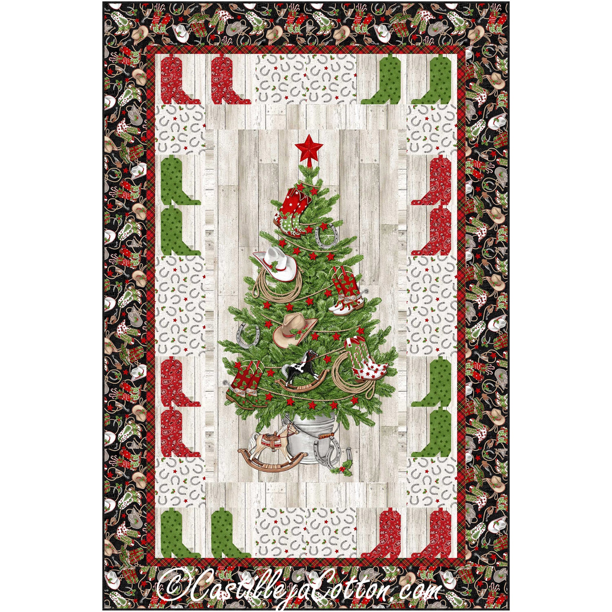Christmas tree panel with fusible appliqued boots borders. Pieced quilt pattern with applique boot border.