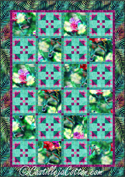 Easy to make pieced block alternated with beautiful hummingbird fabric.
