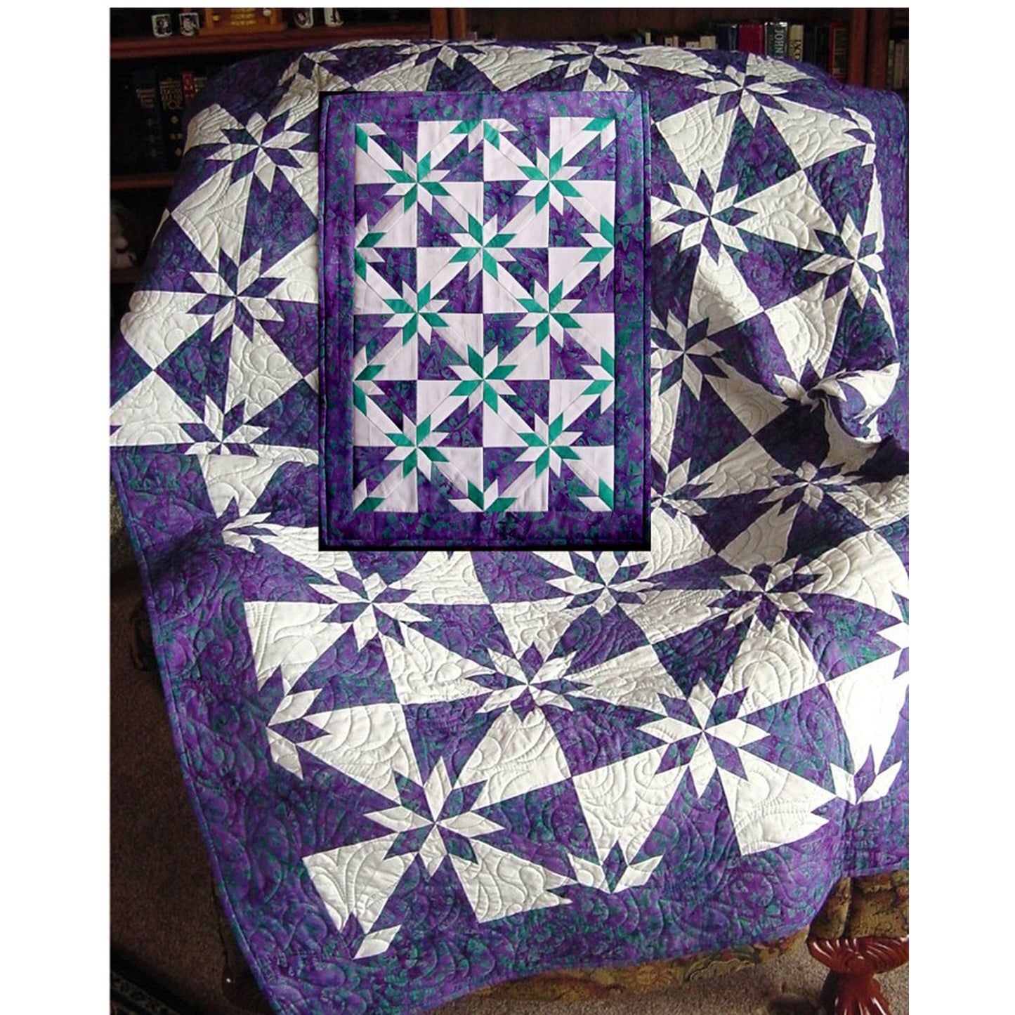 Two color quilt pattern. Main fabric can be divided to create an accent colored star as shown in the inset image. Three project size options are included.