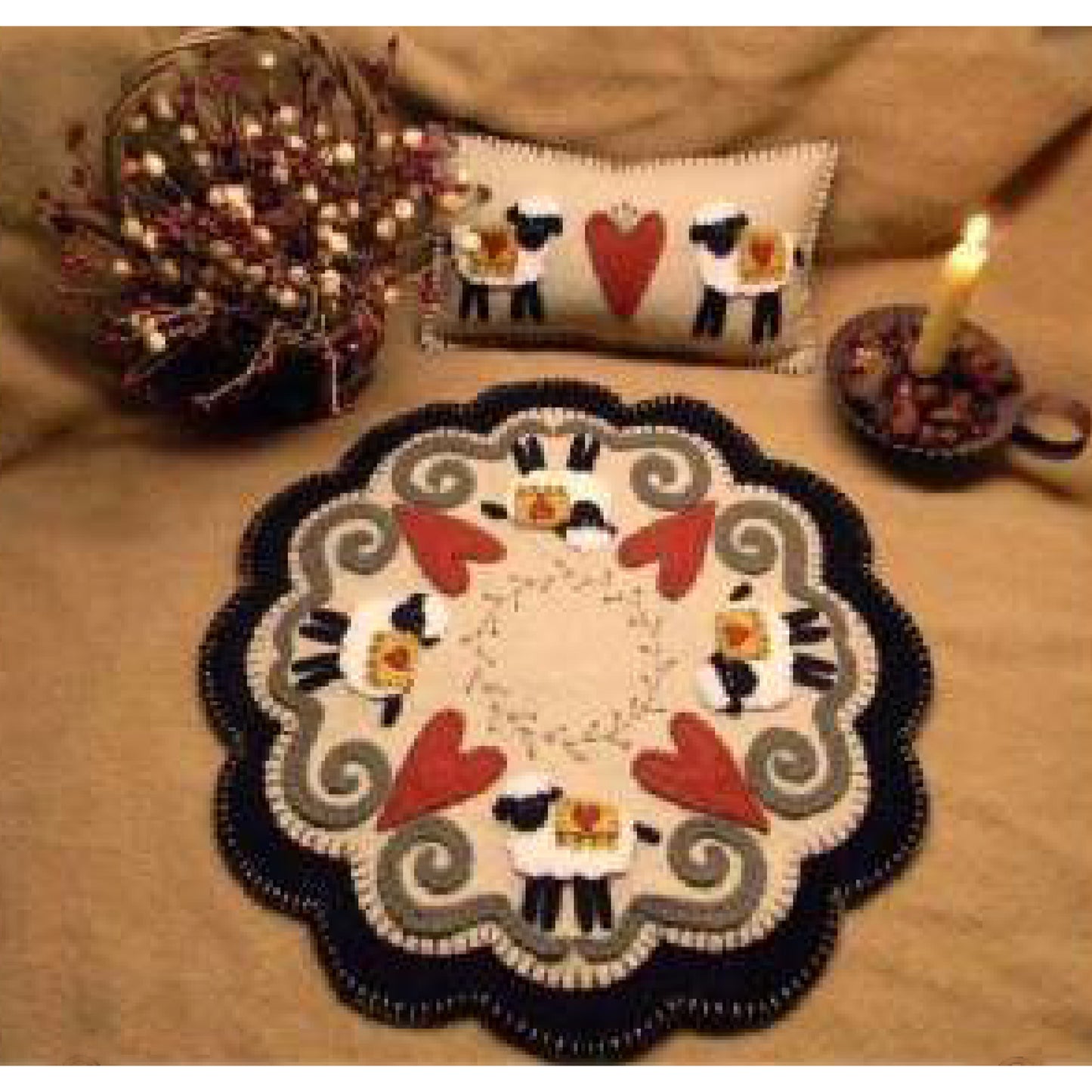 Simply the sweetest little candle mat and shelf pillow pattern! Perfect for Valentine's Day or any day! The candle mat measures approximately 13 inches and the shelf pillow measures 5" by 9". Display together on a shelf or mantel with a candle or basket of berries. Total country charm!