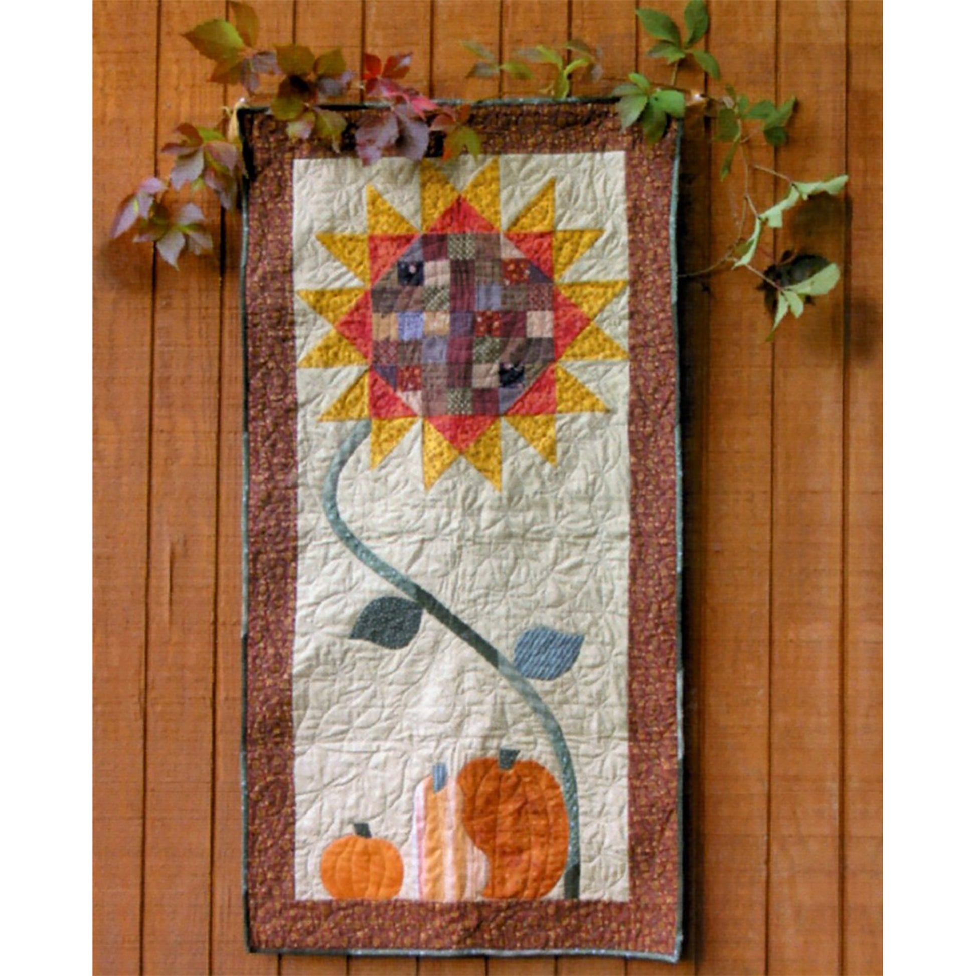 Use a couple of fat quarters and scraps to make this lovely wall hanging. A sunflower shines down on pumpkins in this fall wall hanging quilt pattern.