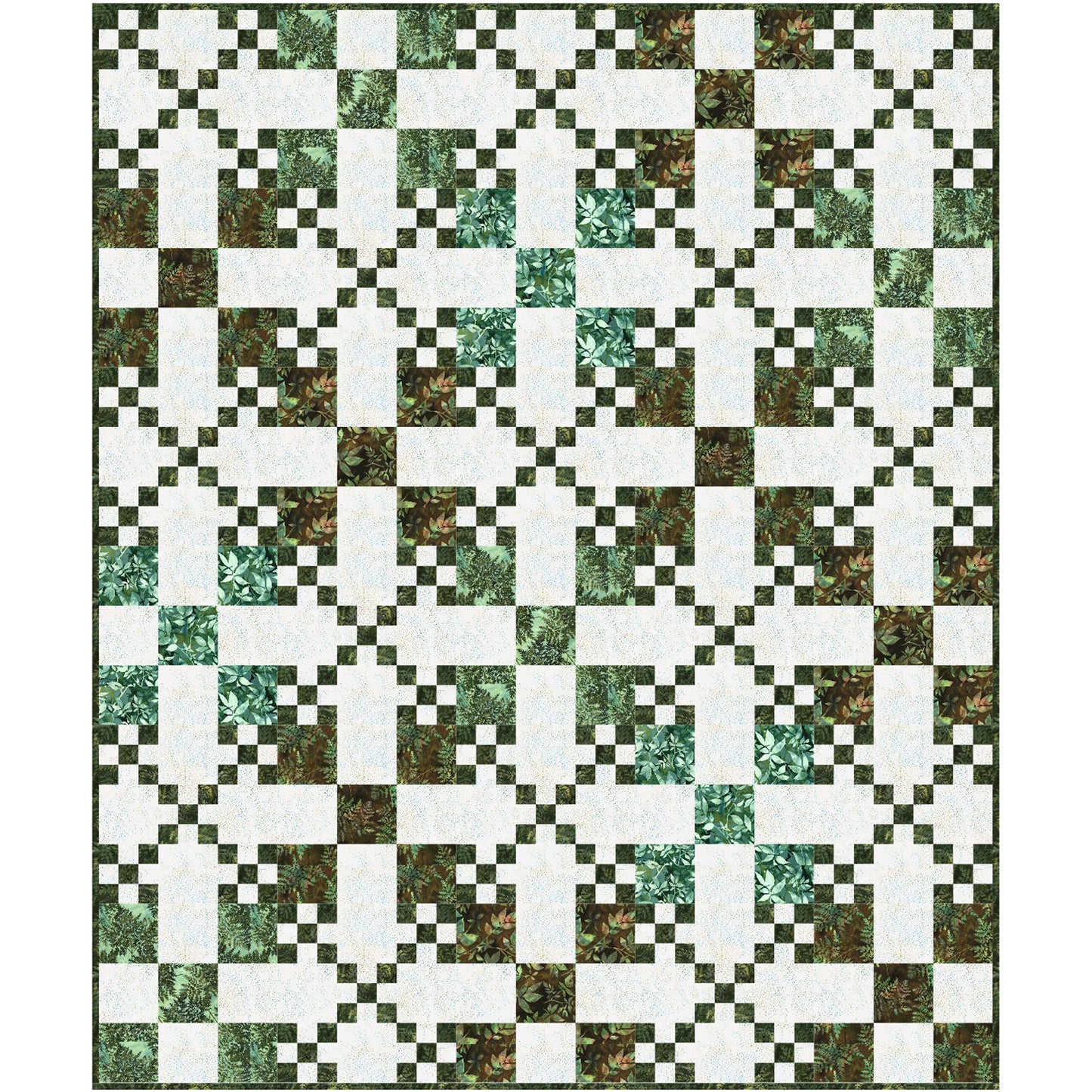 Enjoy the greenery and foliage along the path of the Irish Nine Patch quilt. Quilt design example fabric featuring Hoffman Bali Batiks, Sweet Breeze collection. Quilt finishes at 67" x 81".