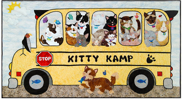 Who doesn’t love their kitty! These kittens come in all shapes, sizes and breeds. Take a close look and you may recognize your own cat perched somewhere on the school bus! If not, you could bump another passenger and give your kitty a seat on the bus by simply making some minor colour adjustments. Ragdoll is walking proud with his catch of the day! Narrow black bias is used to define the bus and full instructions for constructing the bus curves are included in the pattern. It is machine appliquéd and blanket/satin stitched and can be embellished with cute novelty prints for tags. All animal and accent designs are full size. Finished size 40” x 70”.