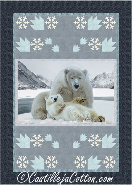 Bear and cub panel with pieced bear paw blocks and fused snowflake blocks. Fabric shown in the sample quilt is Hoffman CA Fabrics Call of the Wild Polar Bears (Available 2024-04-01). Colors: grey, pale blue, white. Black