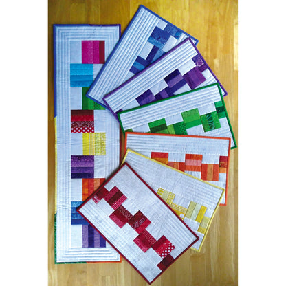 The simple, clean lines of the Leftovers placemats and runner set would have great visual impact in any fabric style or color. The pattern offers instructions for a quick, strip-pieced versions as well as a scrap busting traditionally pieced version. Fabric requirements and cutting instructions are presented in a manner that makes the pattern easy to follow if making only the placemats or only the runner. 6 placemats each measure 12” x 18 ½”. Runner measures 11 ½” x 41 ½”