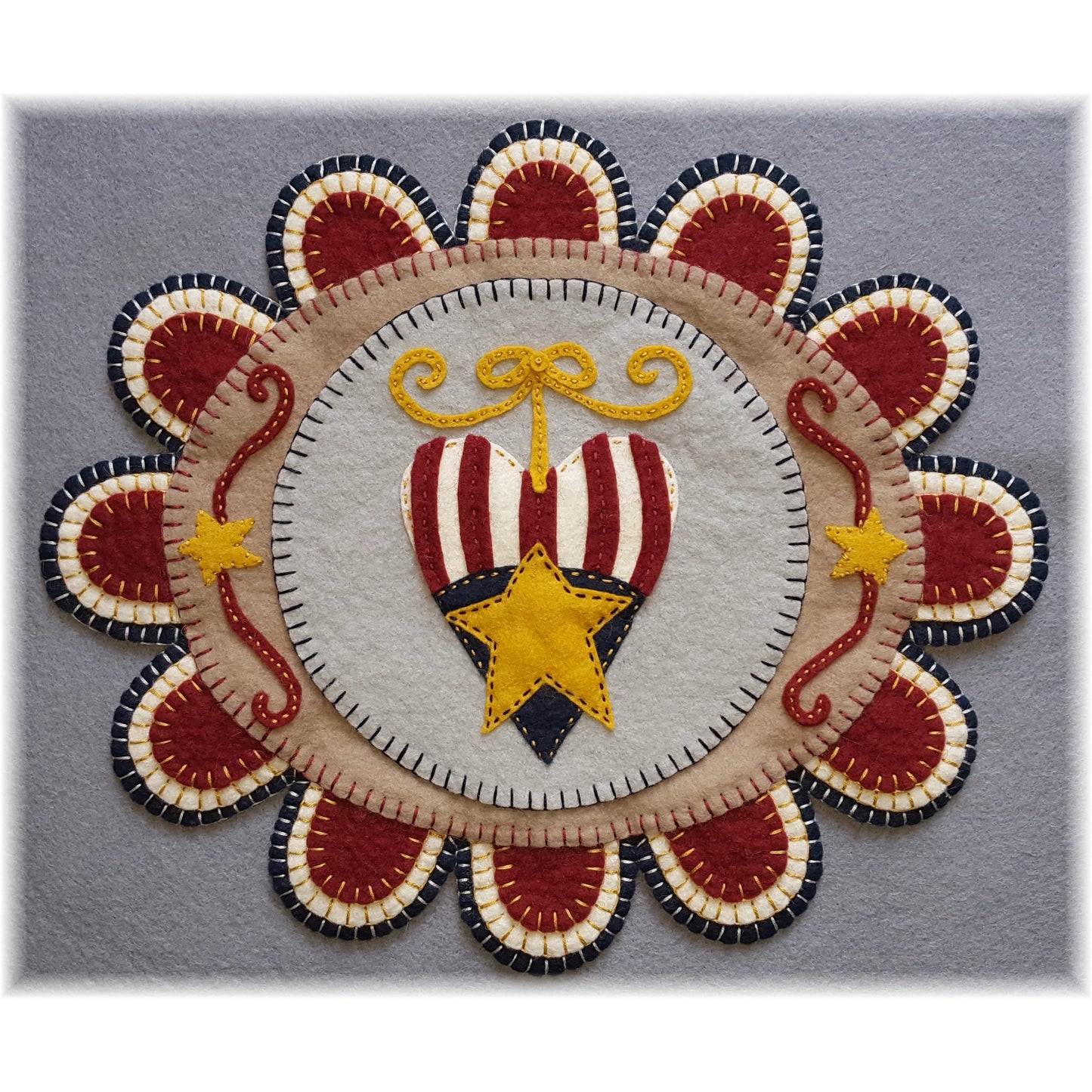 Show your patriotism on Memorial Day, the 4th of July or any time of the year with this fun table/wall mat! This 10 1/2 X 12 inch design can be quickly stitched up using wool or wool felt. A fun and easy project that's sure to be a treasure for many years to come!