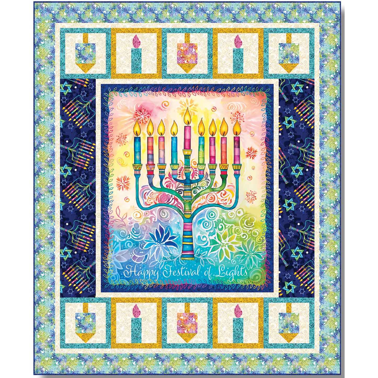 Celebrate the season with the Light and Joy quilt pattern by Matthew Pridemore of The Whimsical Workshop. This 60" x 73" advanced beginner-level lap quilt features a beautiful Menorah panel, pieced and appliquéd dreidels, and candles using the Happy Festival of Lights fabric line. A perfect addition for Hanukkah celebrations.