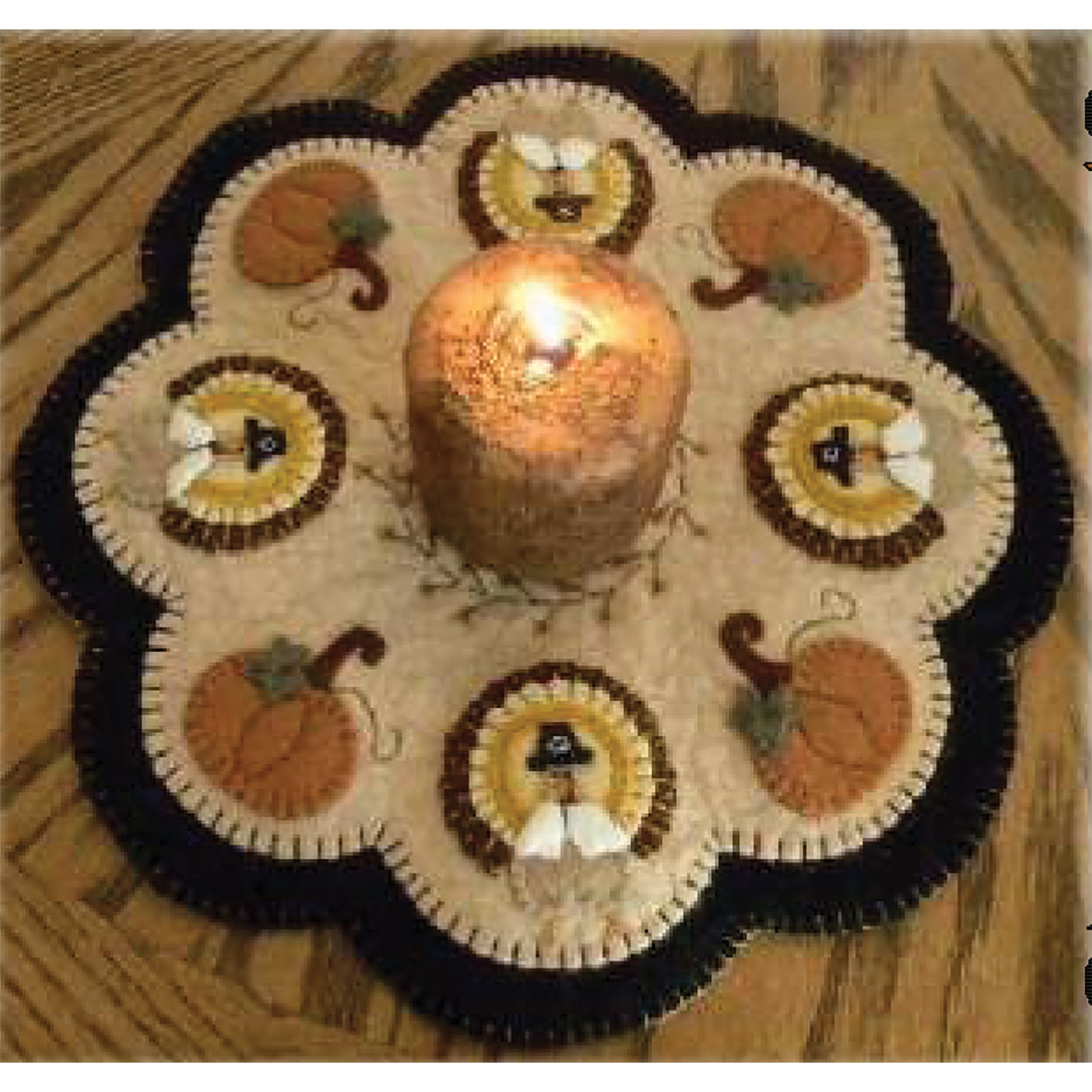 These little turkey pilgrims with pretty pumpkins are just too cute to resist! This is a very easy pattern to stitch up with wool felt in some gorgeous Autumn colors! The completed mat measures approximately 13 inches. Add a candle, small pumpkin, or a dish of candy corn for a wonderfully festive look.