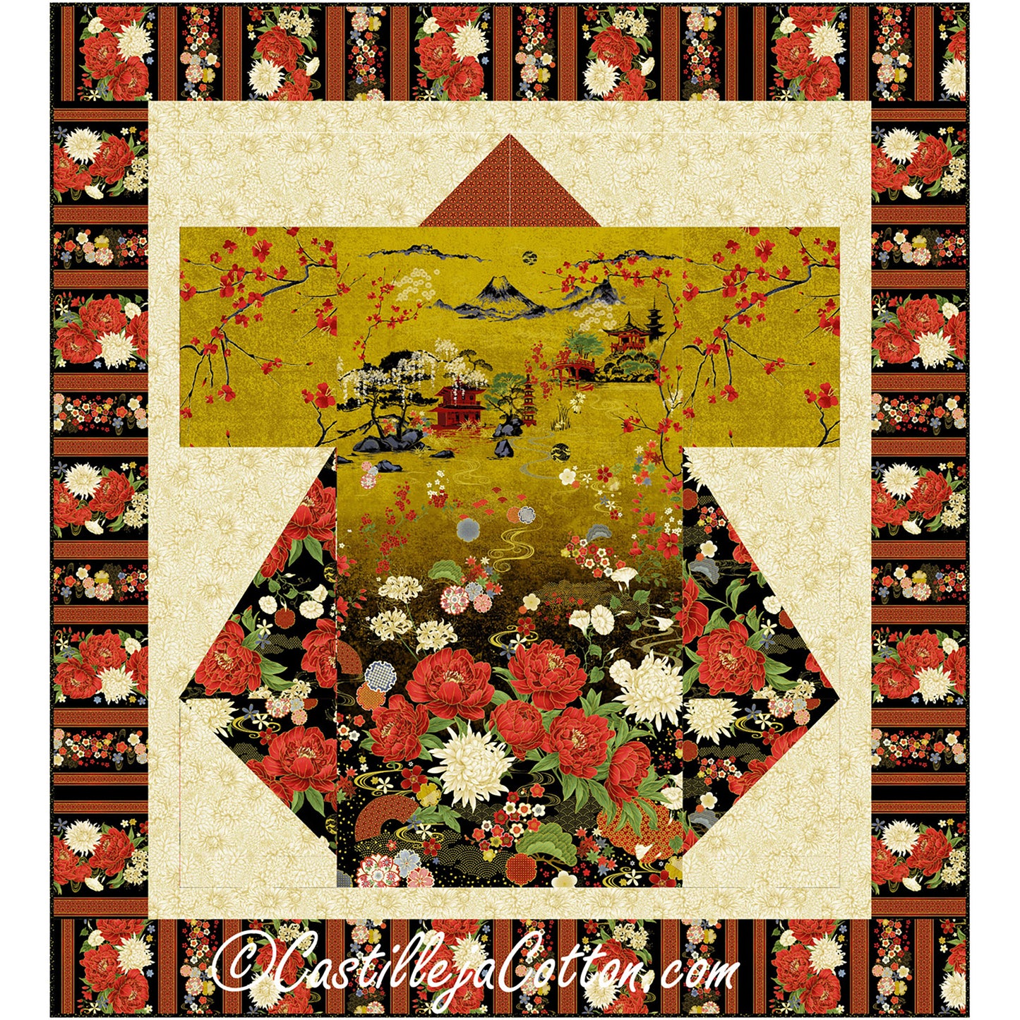 Easy to make kimono quilt pattern using a panel (25" x 43"). Would be beautiful with a large (or small) scale print, too. Fabric shown in the sample quilt is Timeless Treasures Fabric Lotus Garden. Colors: black, red, gold, cream