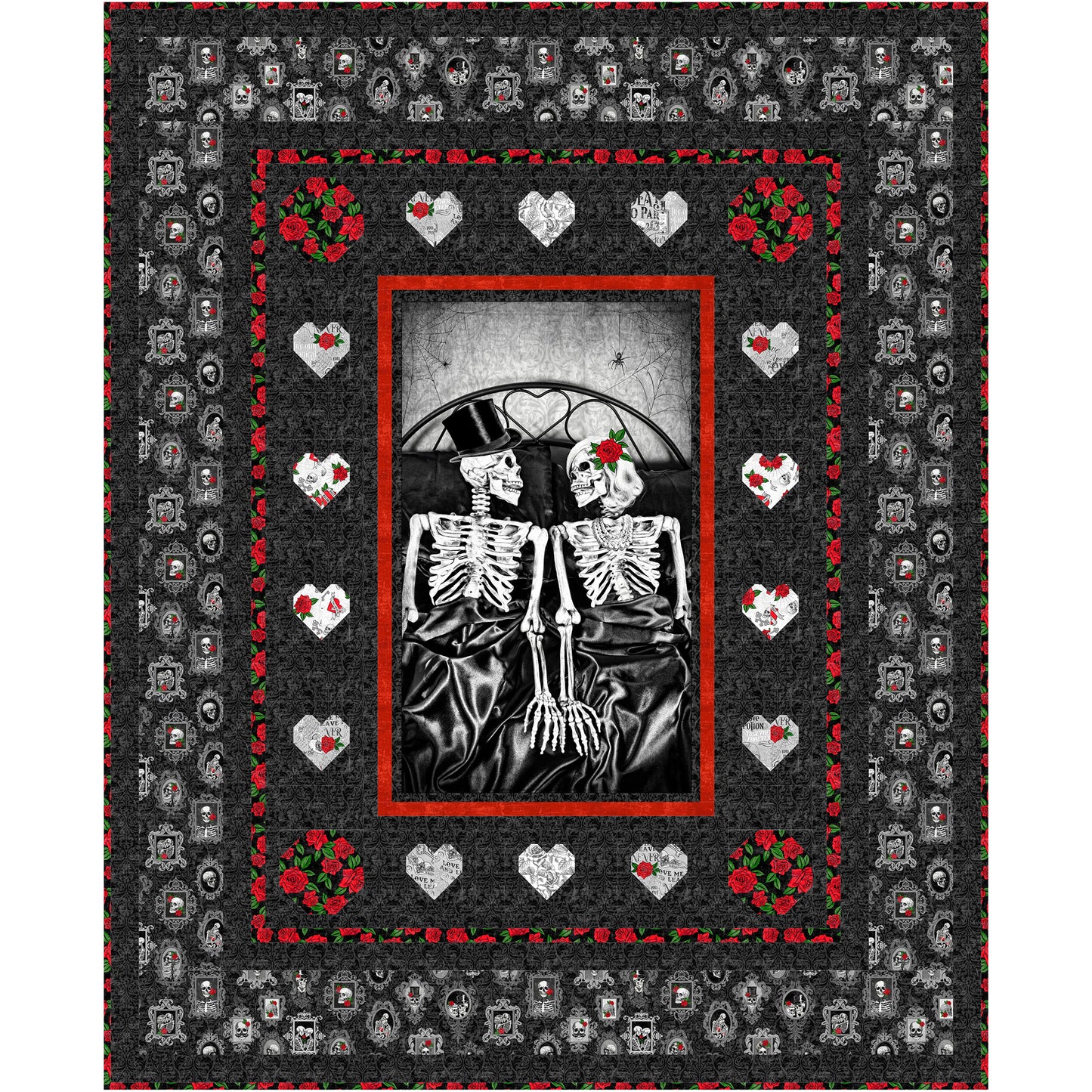 Celebrate a love that transcends time with the Love Eternal quilt pattern, designed for Northcott’s 'Till Death Us Do Part Collection. This unique and striking design features a captivating panel at its center, symbolizing an everlasting bond, beautifully surrounded by sweet hearts that bring a soft, romantic contrast to the bold imagery.