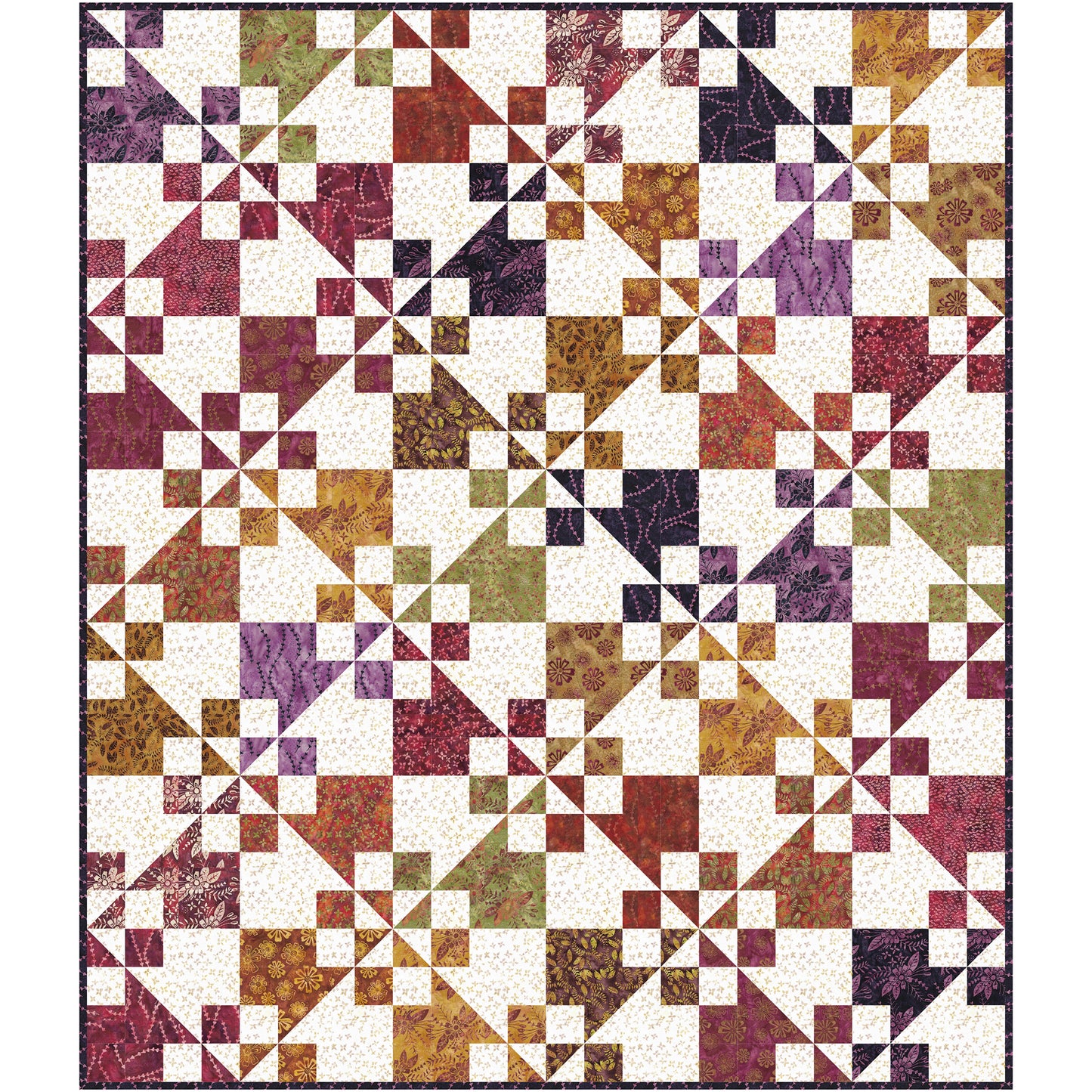 This stunning quilt pattern, "Magic Earth," is inspired by the beauty of autumn and the enchanting hues of nature. Fabric shown in the sample quilt is Earthy Enchantment fabric line by Tiffany Hayes for Island Batiks. This quilt brings warm, earthy tones into your home. The collection features rich, vibrant autumn hues, like deep oranges, rusts, golds, and browns, perfectly capturing the spirit of the season. "Magic Earth" is designed with an innovative technique called the Splice Magic method, which creates stunning visual effects by splicing together fabrics in a way that gives the quilt movement and depth. This pattern uses 10" squares, making it easy to work with pre-cut fabric, while the Splice Magic technique allows the fabric’s beauty to shine through, creating intricate patterns that dance across the quilt.