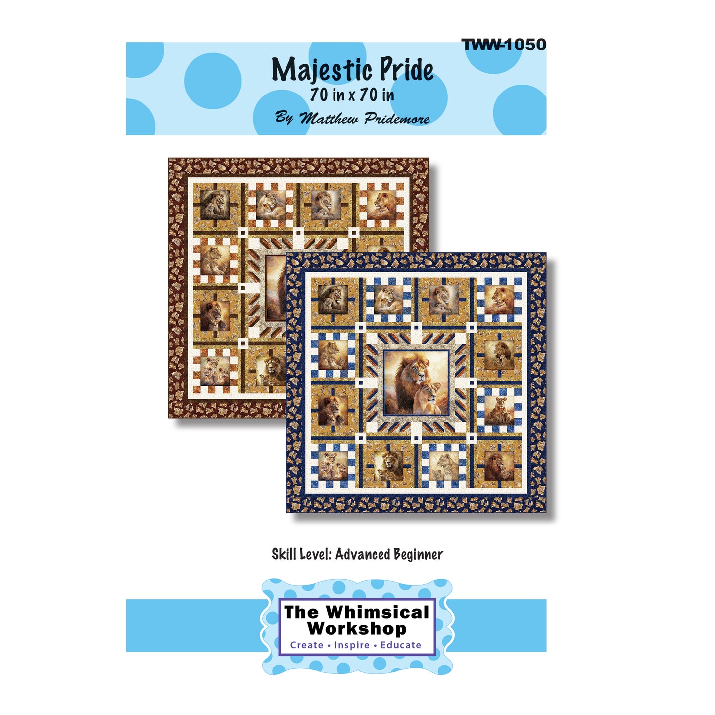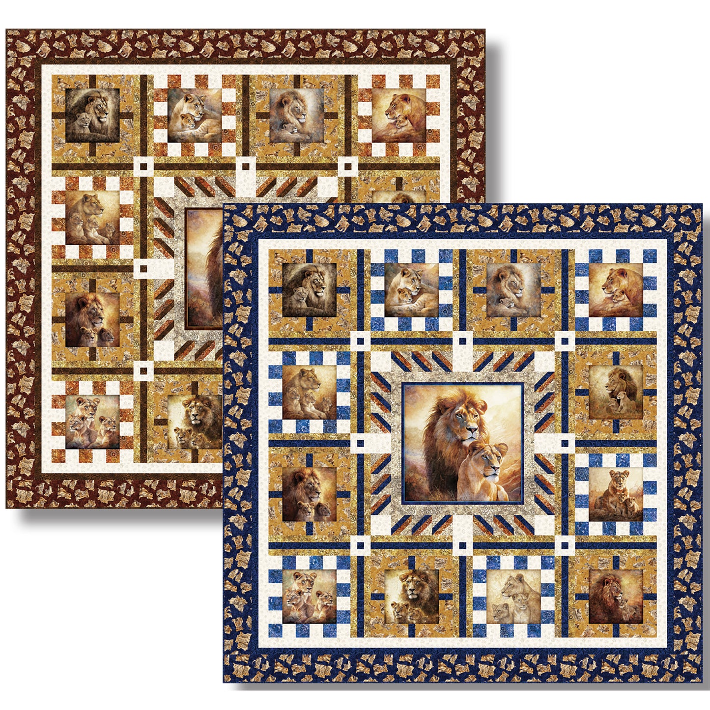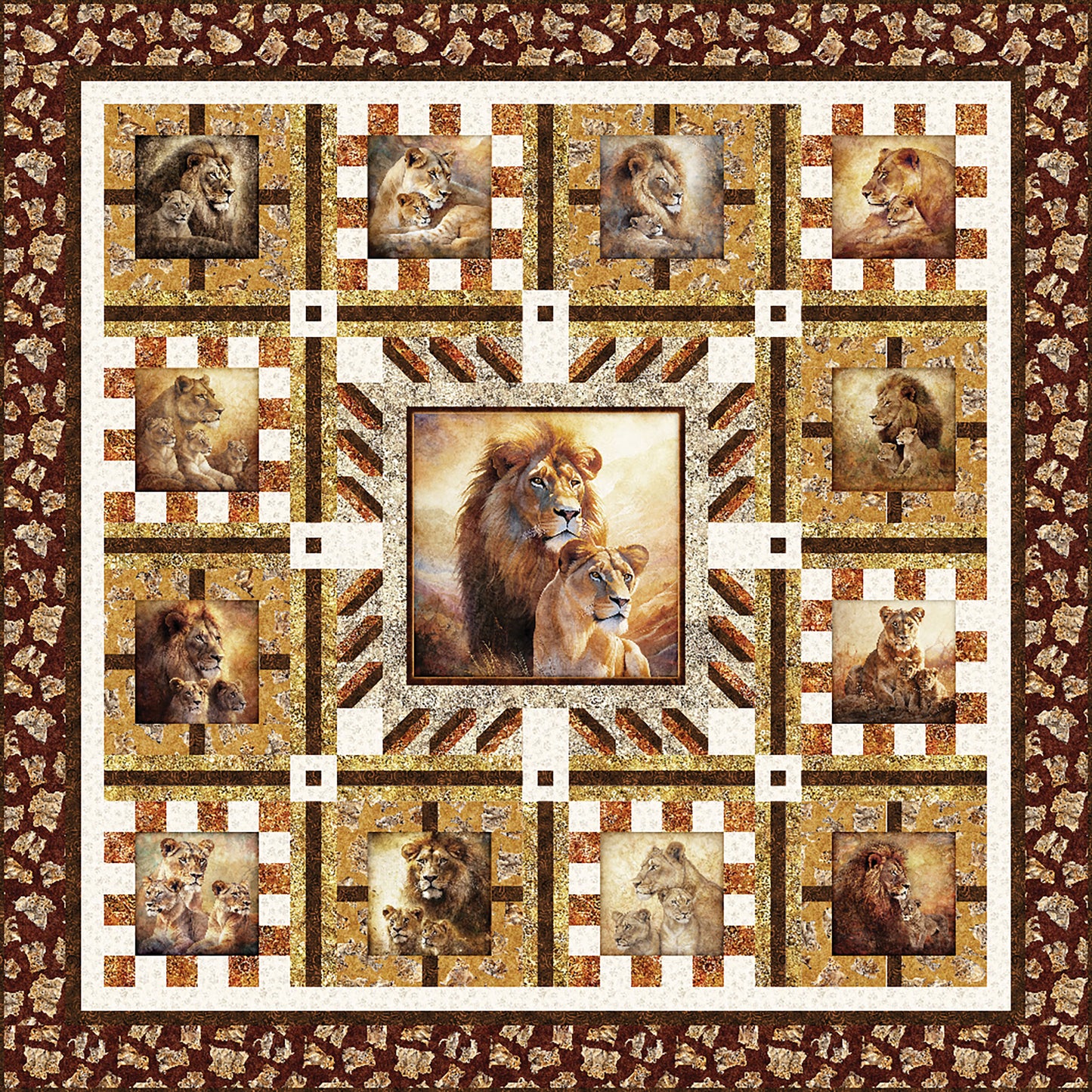 Create mighty lion quilt with Majestic Pride by Matthew Pridemore of The Whimsical Workshop. Fabric shown in the sample quilt is "Roar of the Pride" fabric line from QT Fabrics.