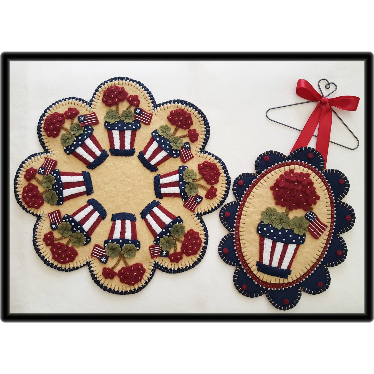 Show your patriotism on Memorial Day, the 4th of July or any time of the year with this fun set! The 11 inch candle mat and 7" X 8 1/2" mini mat can be stitched up using wool felt or wool.