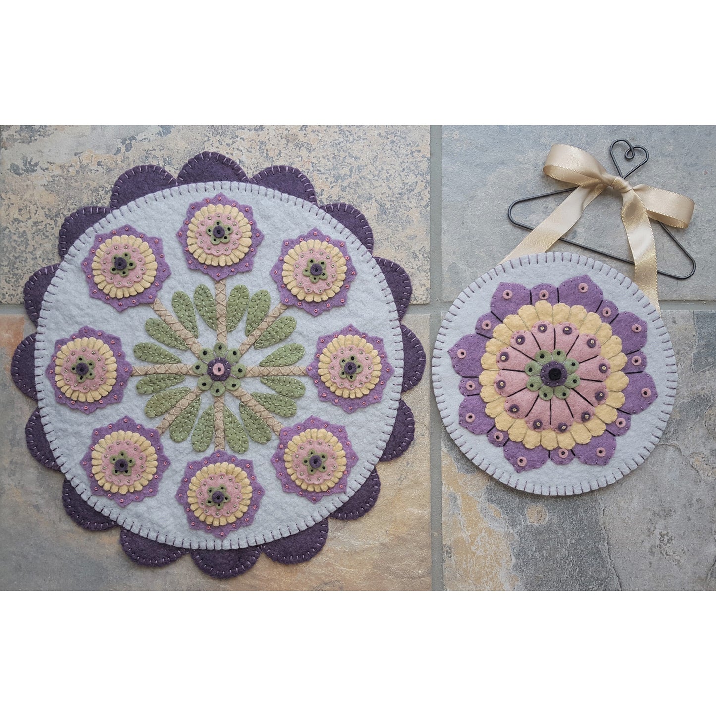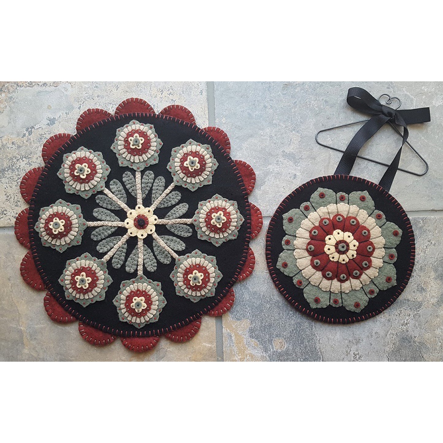 This lovely set can be stitched up using wool felt or wool in prim colors, or pastels to make it more Spring-like. The pattern includes both. The table mat measures approximately 11 1/2" and the mini mat measures 6 1/2".