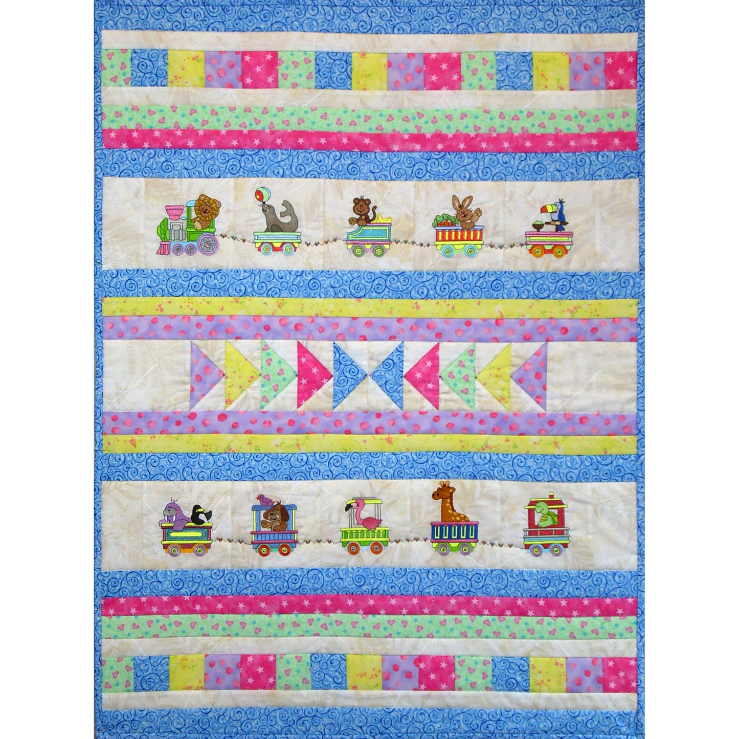The embroidered circus train as seen on this quilt is from the Baby Train Embroidery Pack of Oklahoma Embroidery Supply Design and IS NOT included with the pattern.