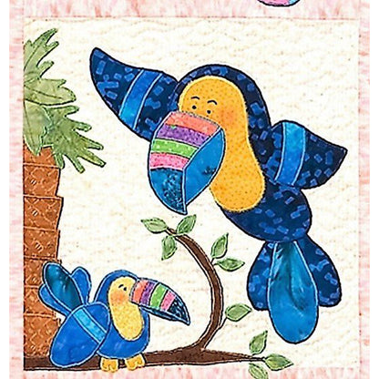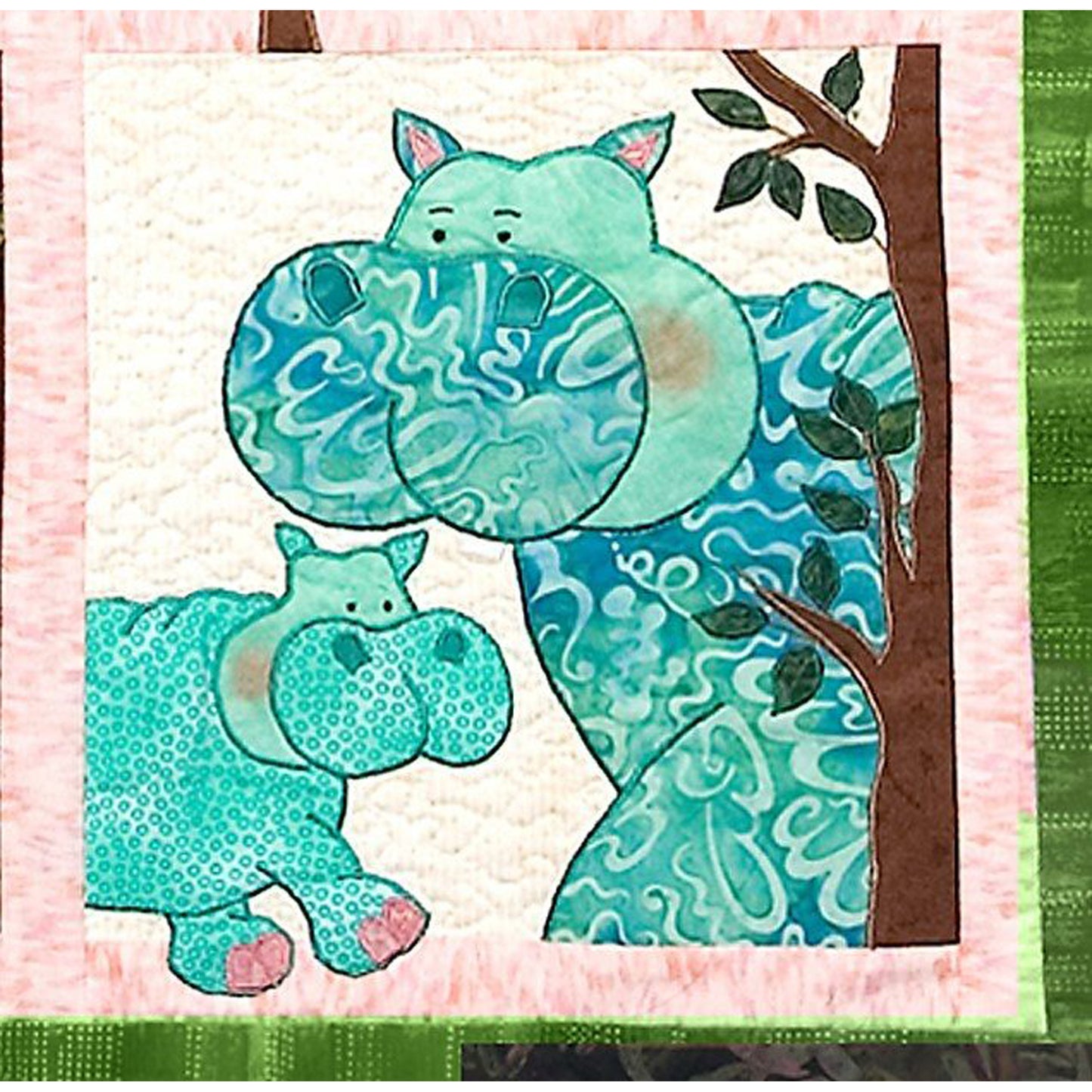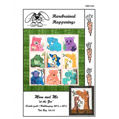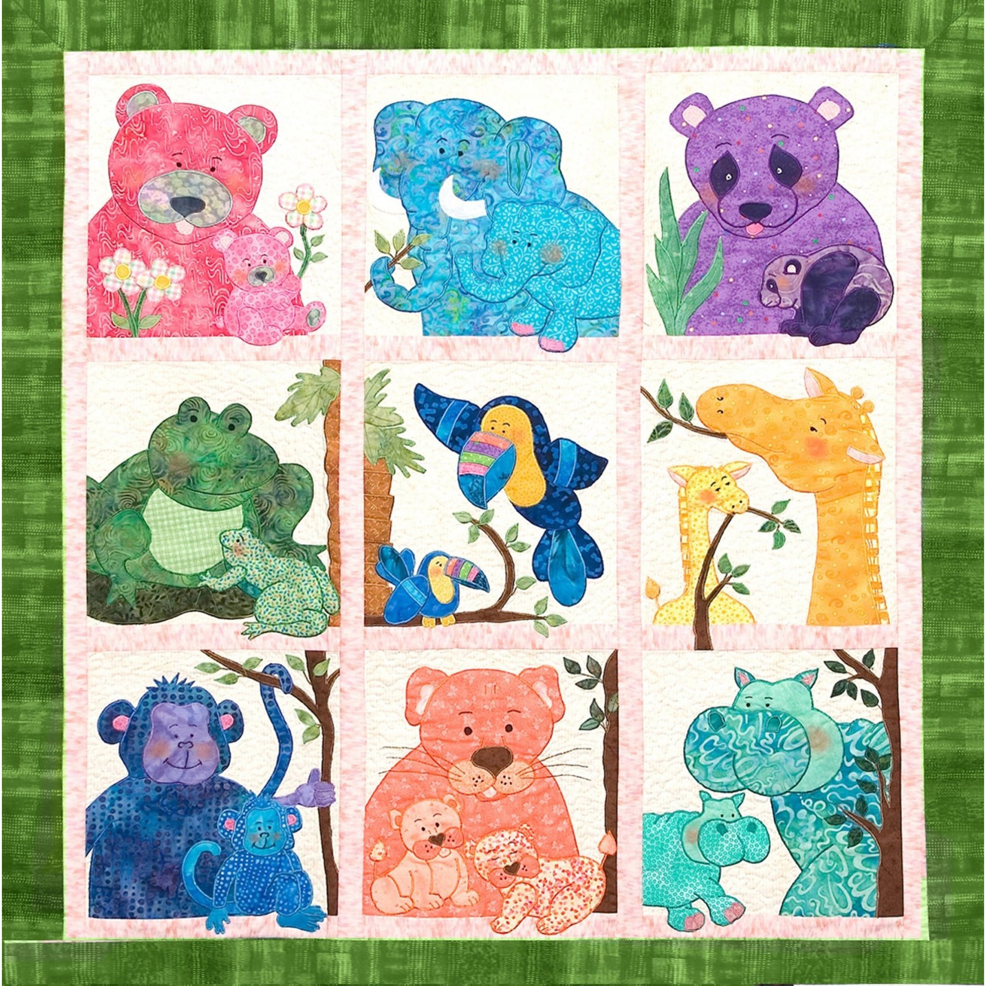 Any child would love this bright and cheery wall hanging made up of nine colourful Zoo babies and their Moms. Use your imagination to create it in bright colours like the pattern, pastels, and batiks or make it up in authentic animal prints for a totally different look. Included in the pattern are the instructions for a matching tote bag; or make it into a pillow -just choose your favorite block and away you go! It is a machine appliquéd pattern, using fusible web and satin stitch. All designs and accents are full size. Quilt 42 ½” x 45 ½”; Tote Bag 16” x 16”