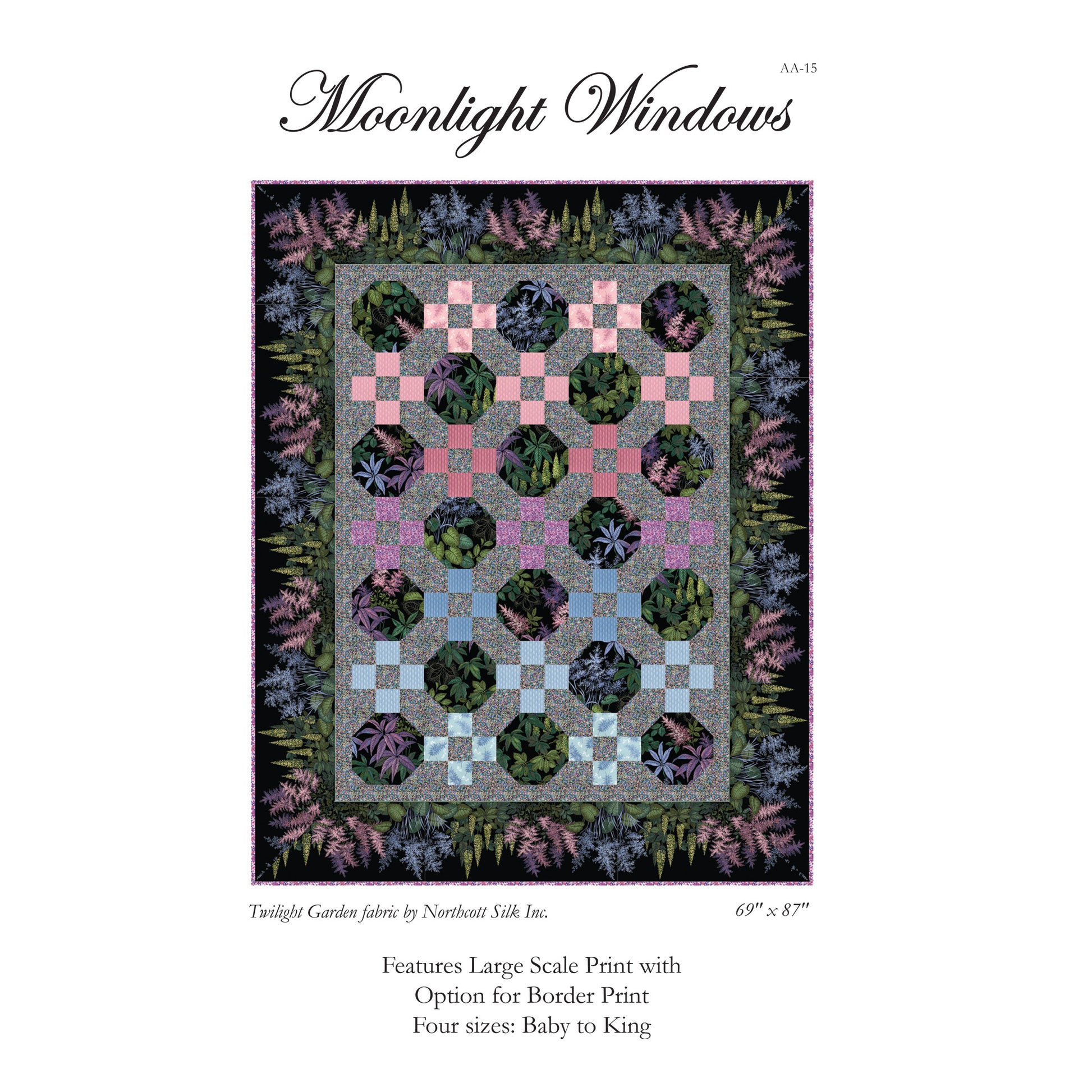 Moonlight Windows quilt pattern is your opportunity to display a large-scale print to a definite advantage. Included is an option for a border print. This pattern features four sizes, from Baby to King.