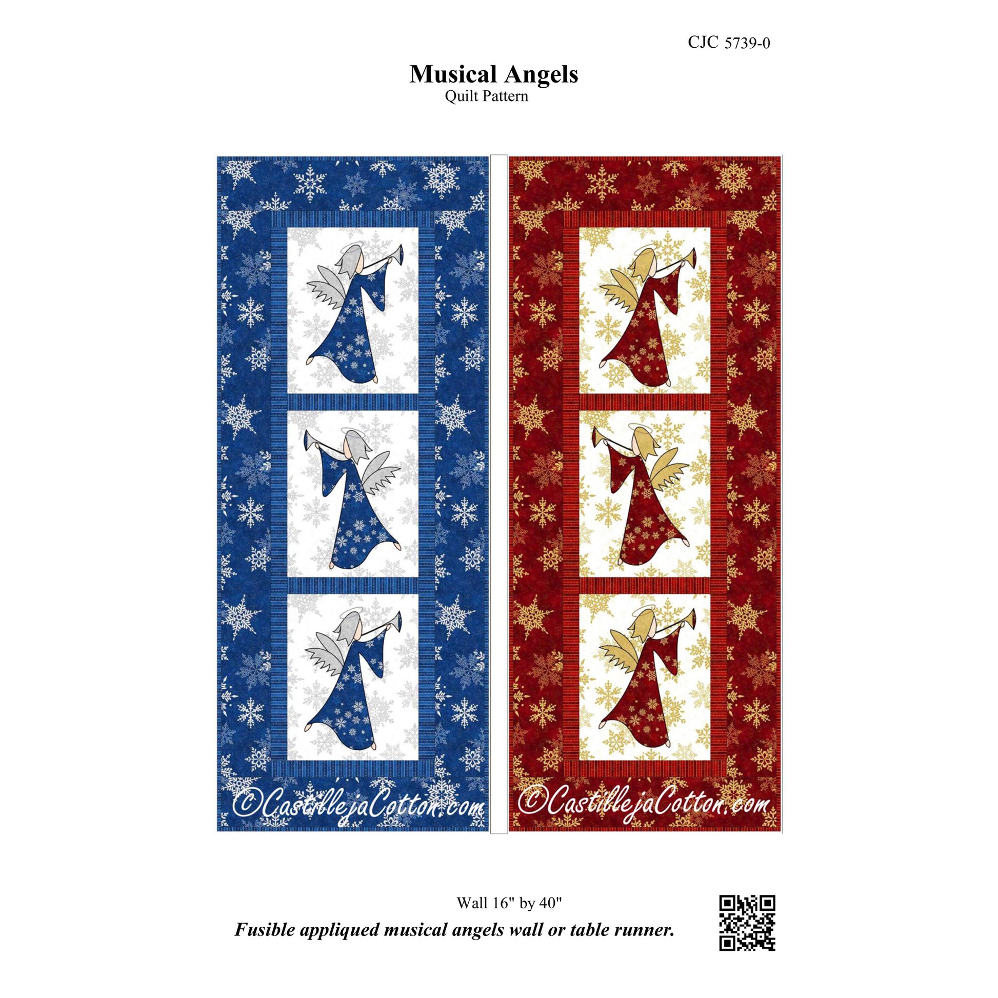 Fusible appliqued musical angels wall or table runner. Pieced wall hanging pattern with applique angels. Would make a great addition to your Christmas decorations.